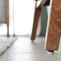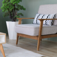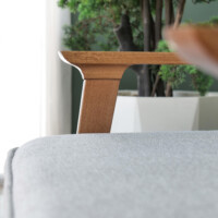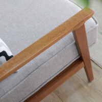 The armchair complements the set with its exposed wooden frame and open, angular lines. Its lighter, more sculptural structure adds contrast while still matching the overall style through the same upholstery and a single coordinating pillow. This detail gives the ensemble a distinctive identity and reinforces the modern–Scandinavian character.