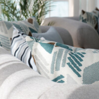 A balanced selection of pillows adds detail and personality to the sofas. Different patterns and textures introduce visual interest while maintaining harmony with the minimalist design.