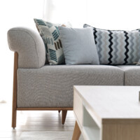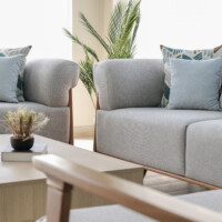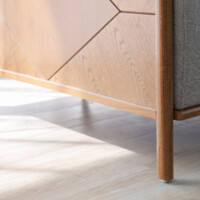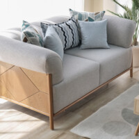 The structure of the sofas is built from solid wood, providing strength and durability. The sides feature geometric wooden paneling that adds a refined decorative touch. The legs are slim, elevated, and slightly tapered, giving the whole set an airy and light presence. The seating is upholstered in a smooth, comfortable fabric suitable for everyday use.