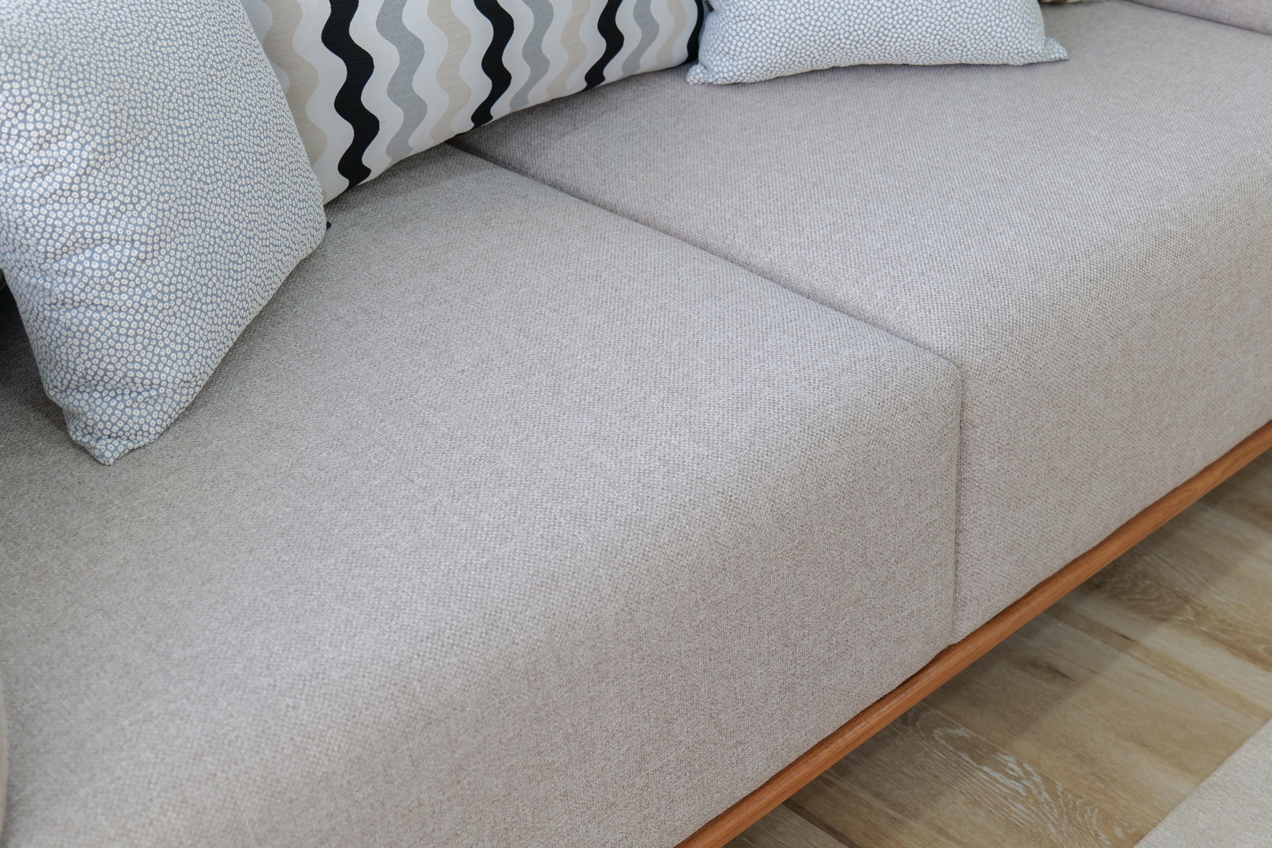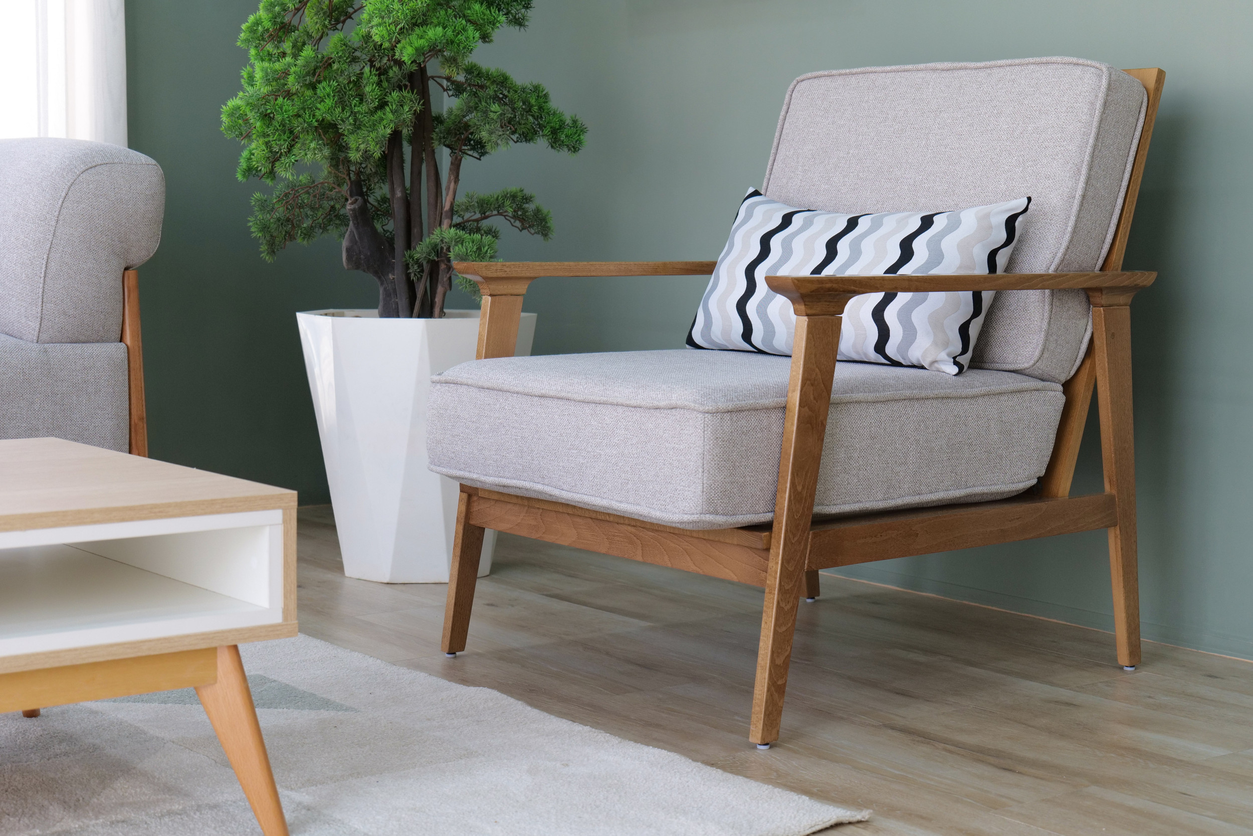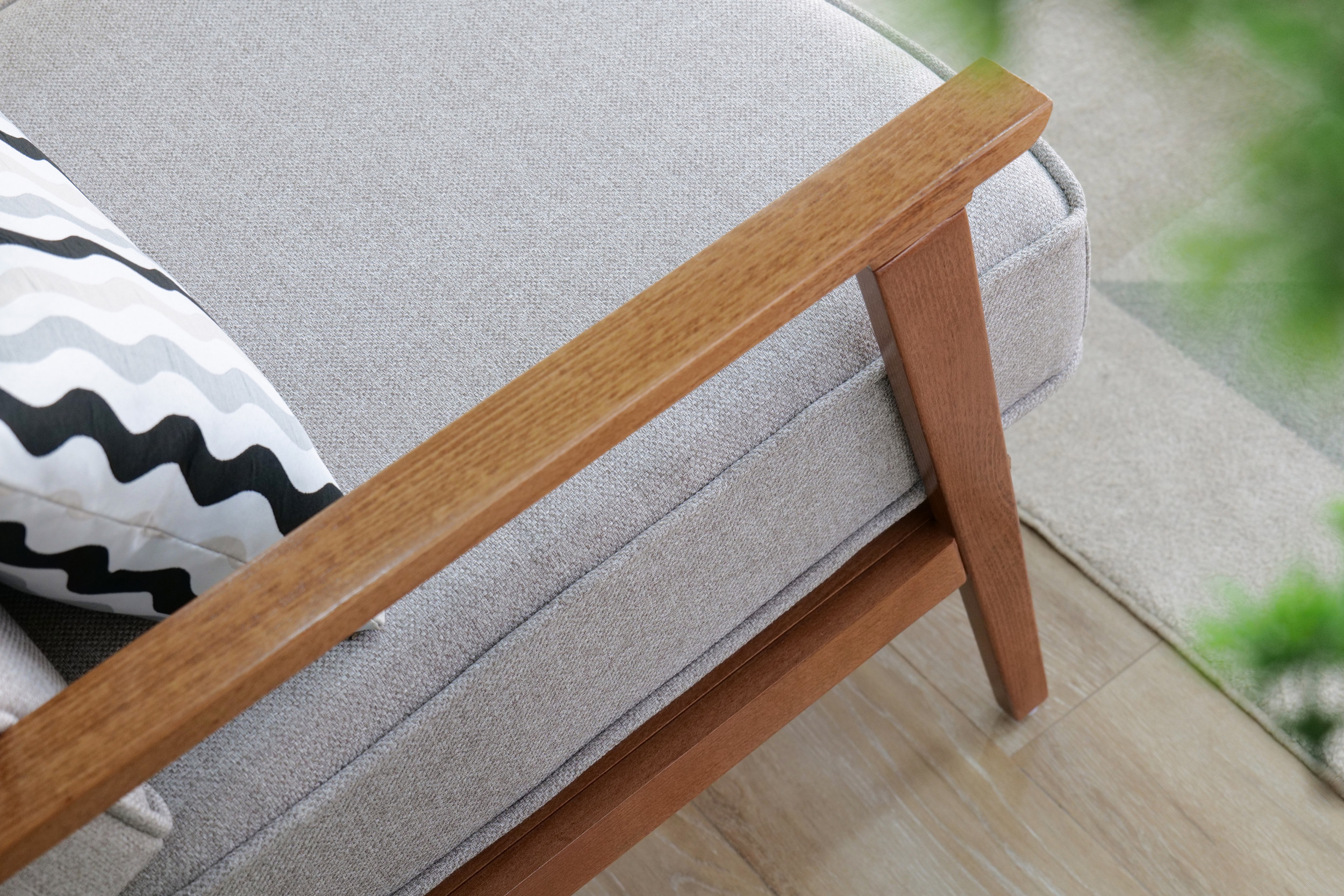 The armchair complements the set with its exposed wooden frame and open, angular lines. Its lighter, more sculptural structure adds contrast while still matching the overall style through the same upholstery and a single coordinating pillow. This detail gives the ensemble a distinctive identity and reinforces the modern–Scandinavian character.