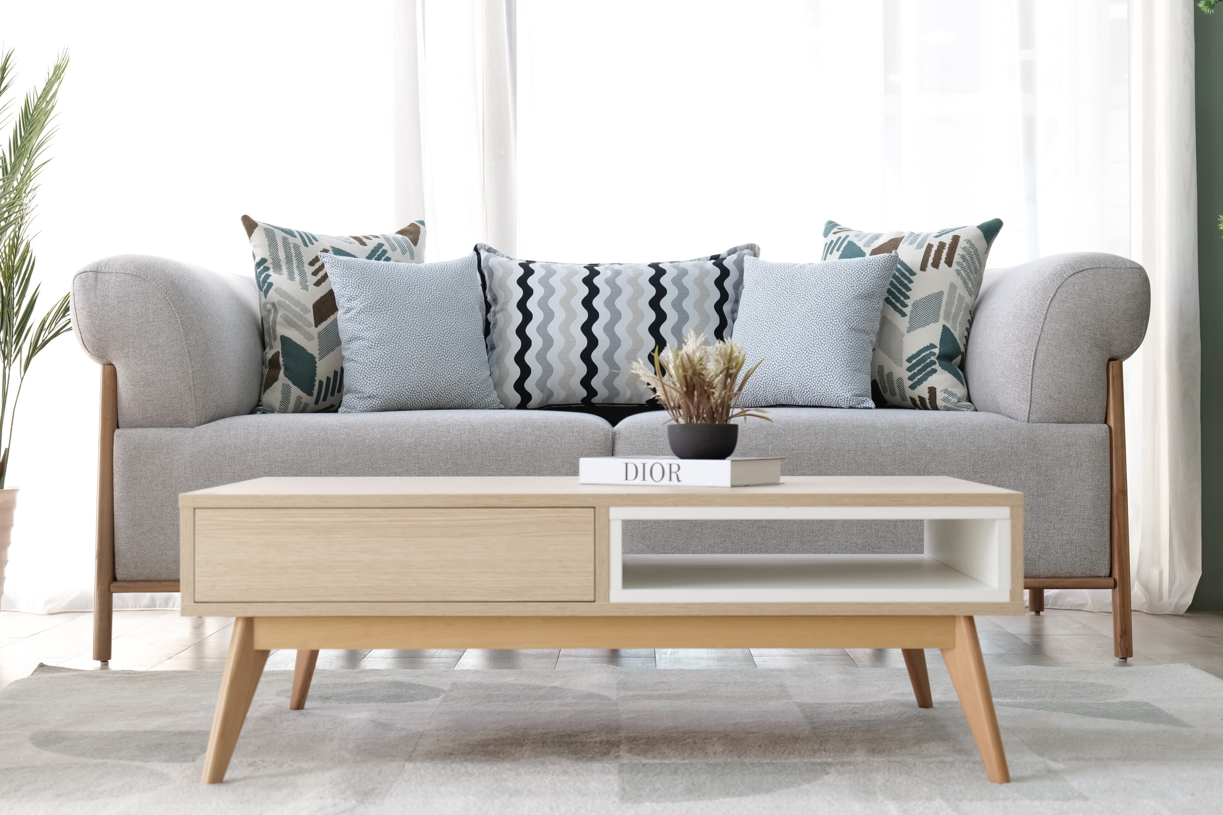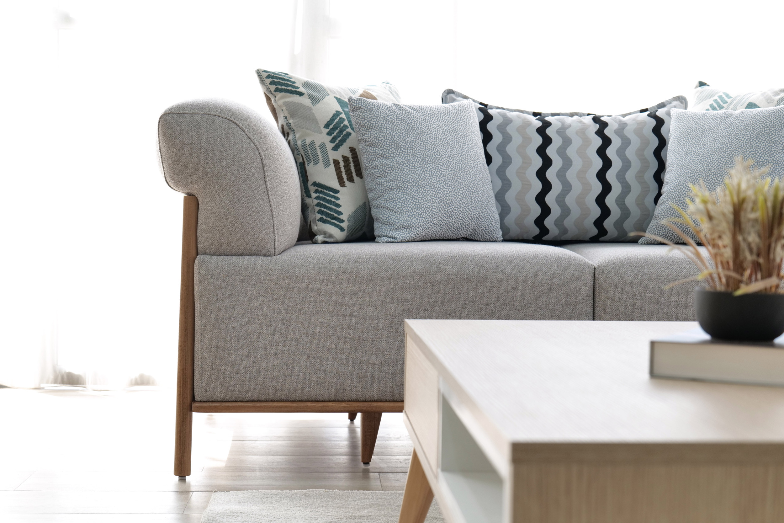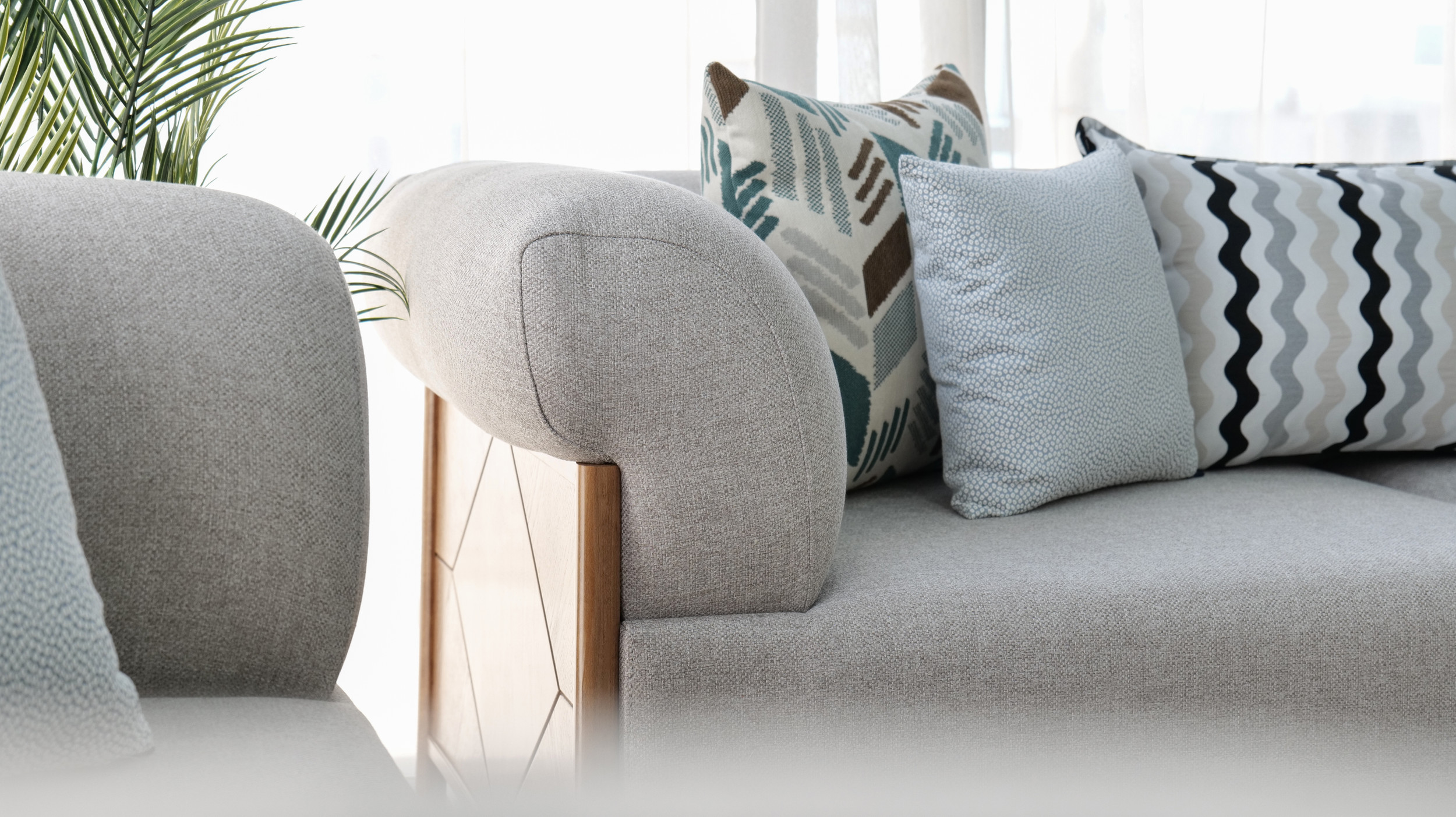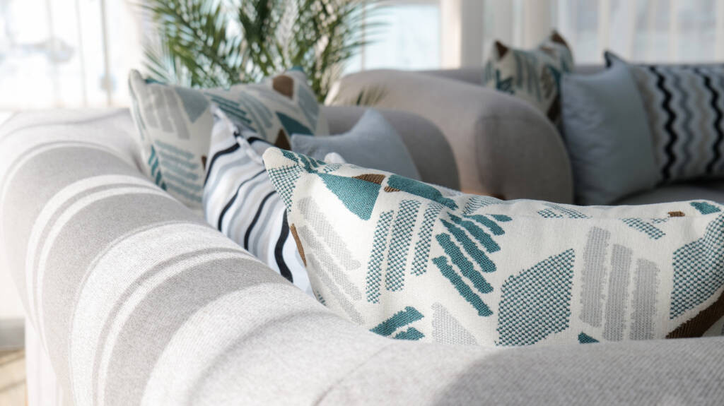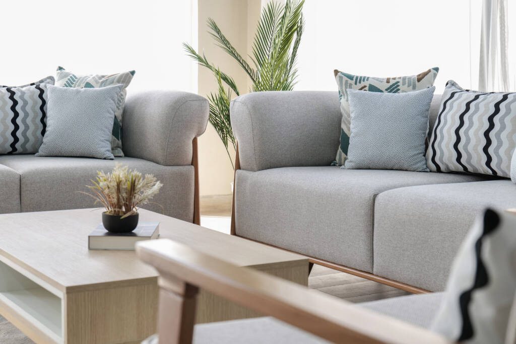 A balanced selection of pillows adds detail and personality to the sofas. Different patterns and textures introduce visual interest while maintaining harmony with the minimalist design.