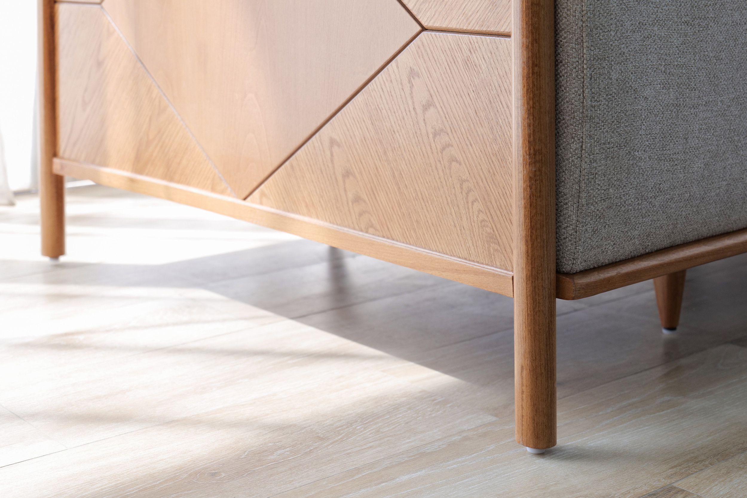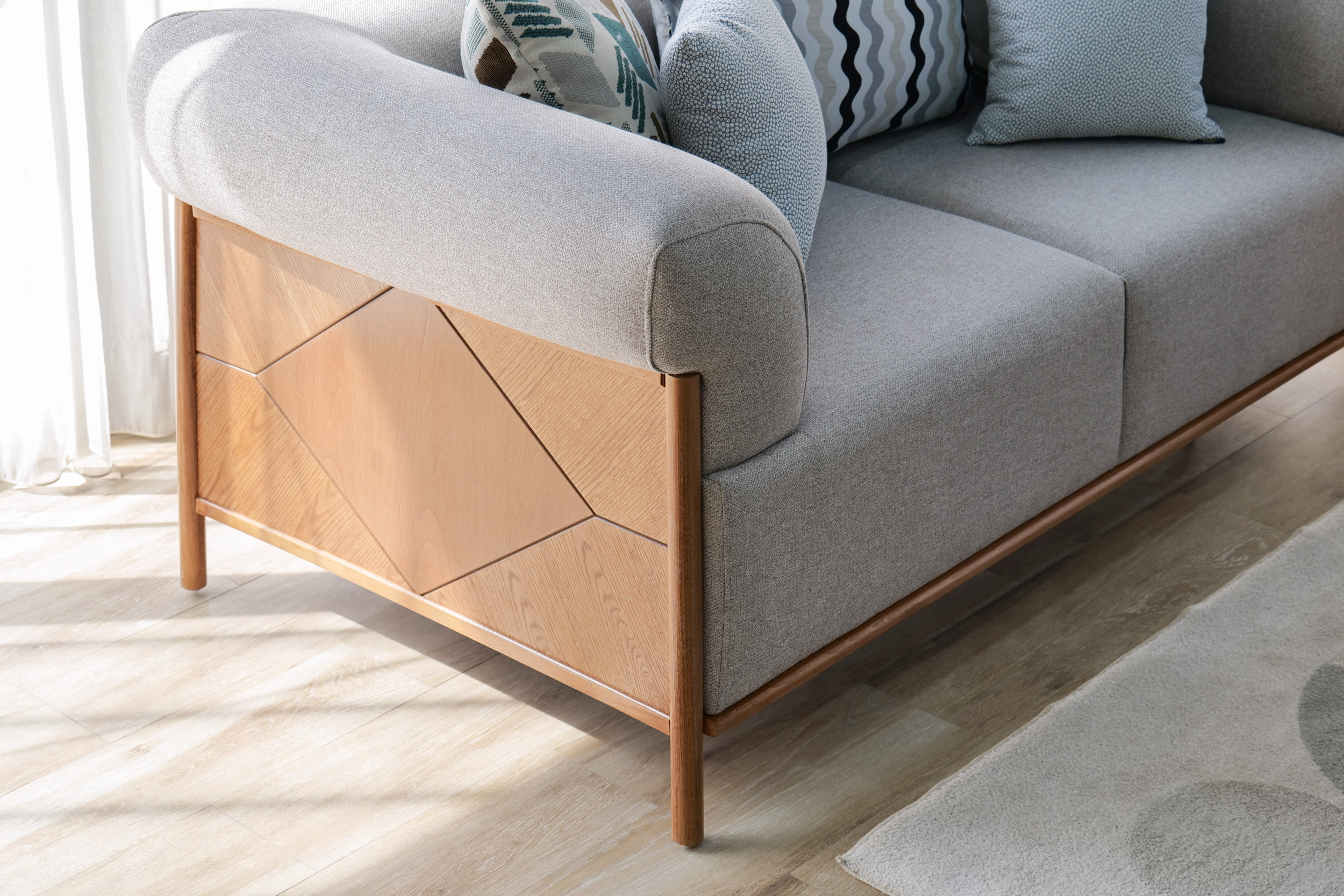 The structure of the sofas is built from solid wood, providing strength and durability. The sides feature geometric wooden paneling that adds a refined decorative touch. The legs are slim, elevated, and slightly tapered, giving the whole set an airy and light presence. The seating is upholstered in a smooth, comfortable fabric suitable for everyday use.