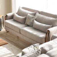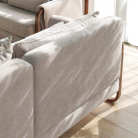 The legs are discreet, lightly elevated, and partially incorporated into the curved wooden structure. This design gives the sofa a floating appearance while preserving stability and strength.