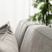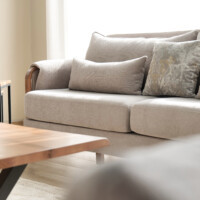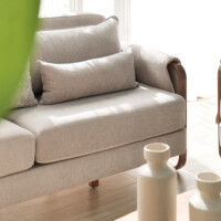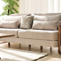 The cushions are plush and supportive, offering a balanced comfort that maintains its shape over time. The accent pillows complement the overall look with neutral textures and subtle patterns, adding depth without overwhelming the minimal design. Their presence reinforces the cozy, tranquil identity of the collection.