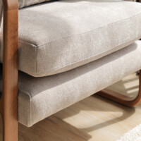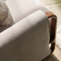 The structure is built on a sturdy, well-balanced frame, ensuring stability and long-term durability. Its distinctive wooden contour — smoothly bent around the armrests and base — highlights craftsmanship and adds a sculptural quality to the entire ensemble. The wood features a warm, natural finish that enhances the softness of the upholstery and strengthens the organic aesthetic.