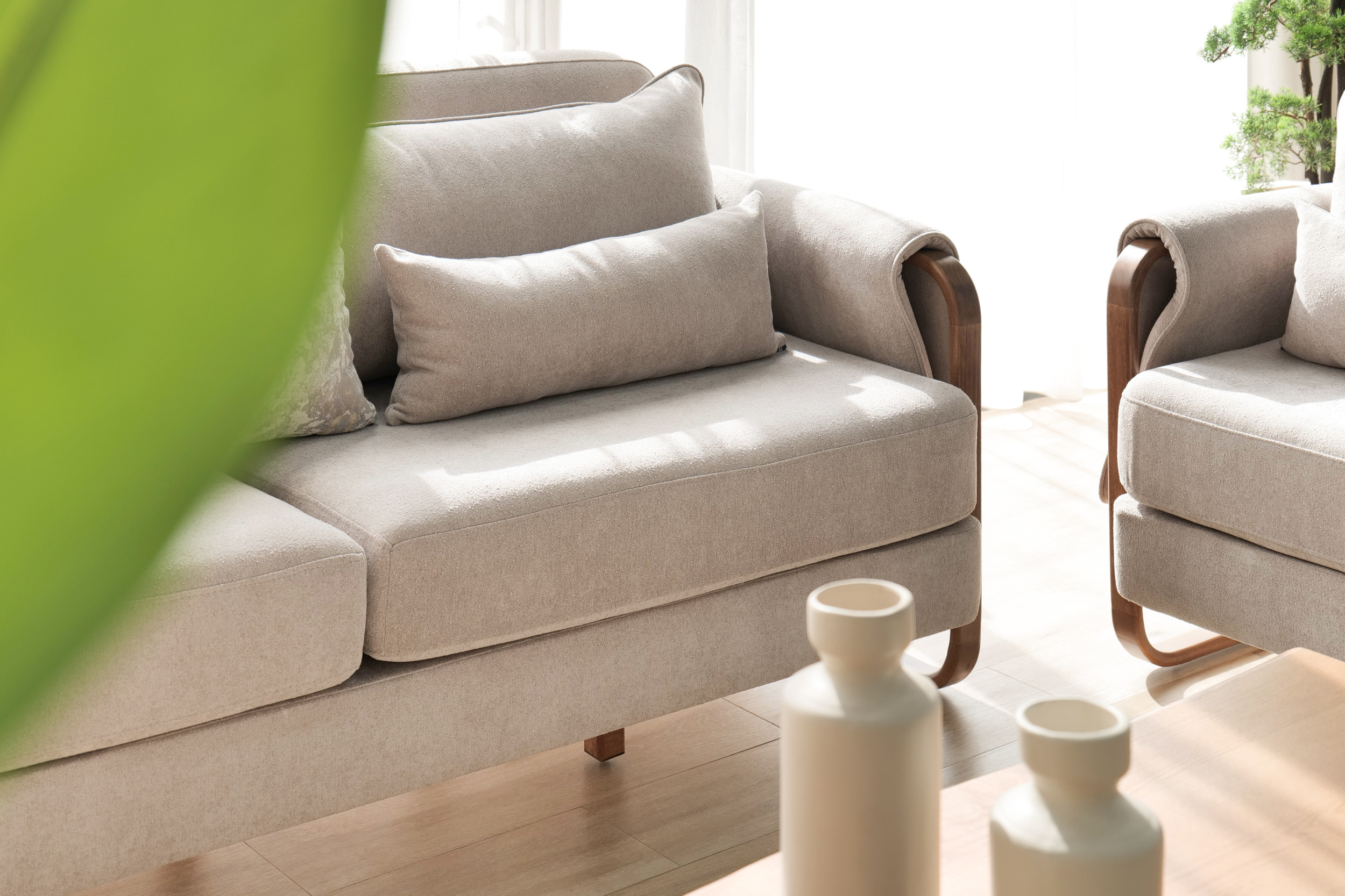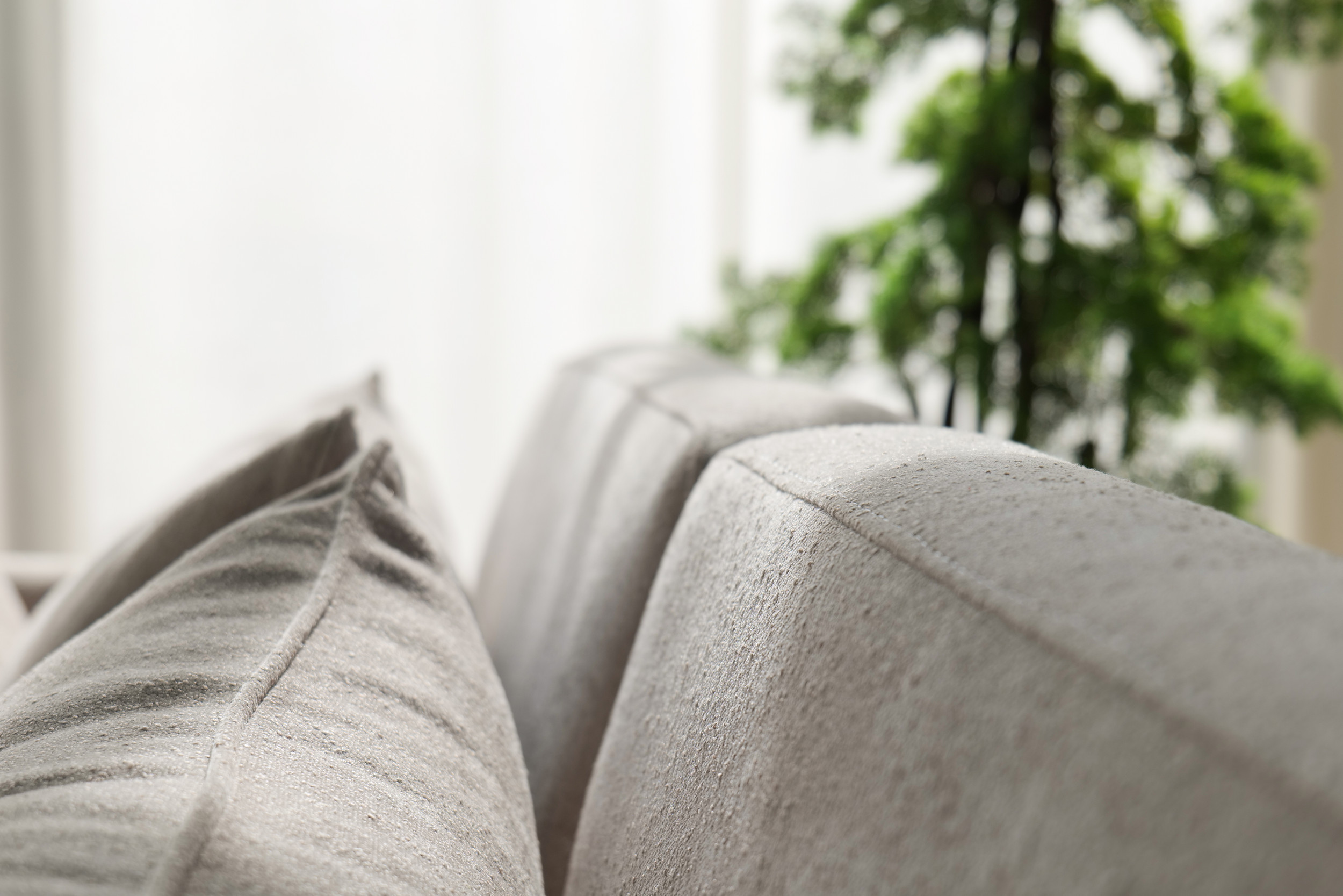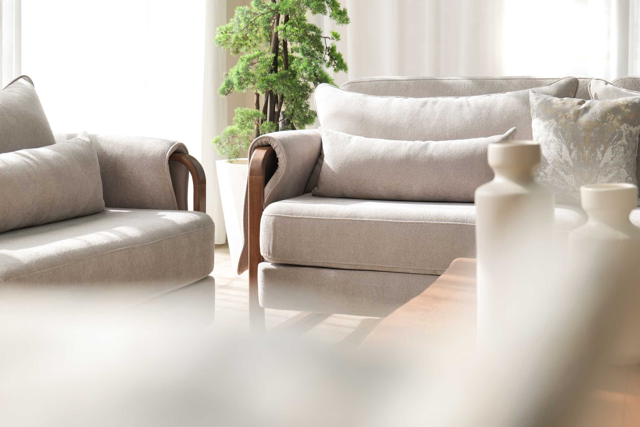 The cushions are plush and supportive, offering a balanced comfort that maintains its shape over time. The accent pillows complement the overall look with neutral textures and subtle patterns, adding depth without overwhelming the minimal design. Their presence reinforces the cozy, tranquil identity of the collection.