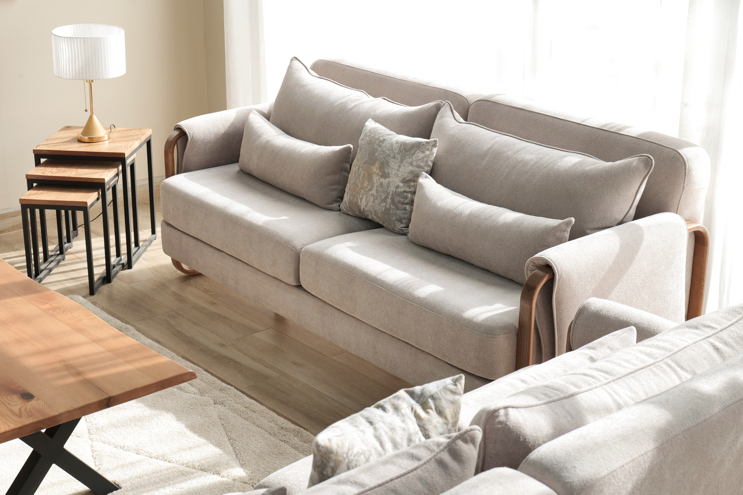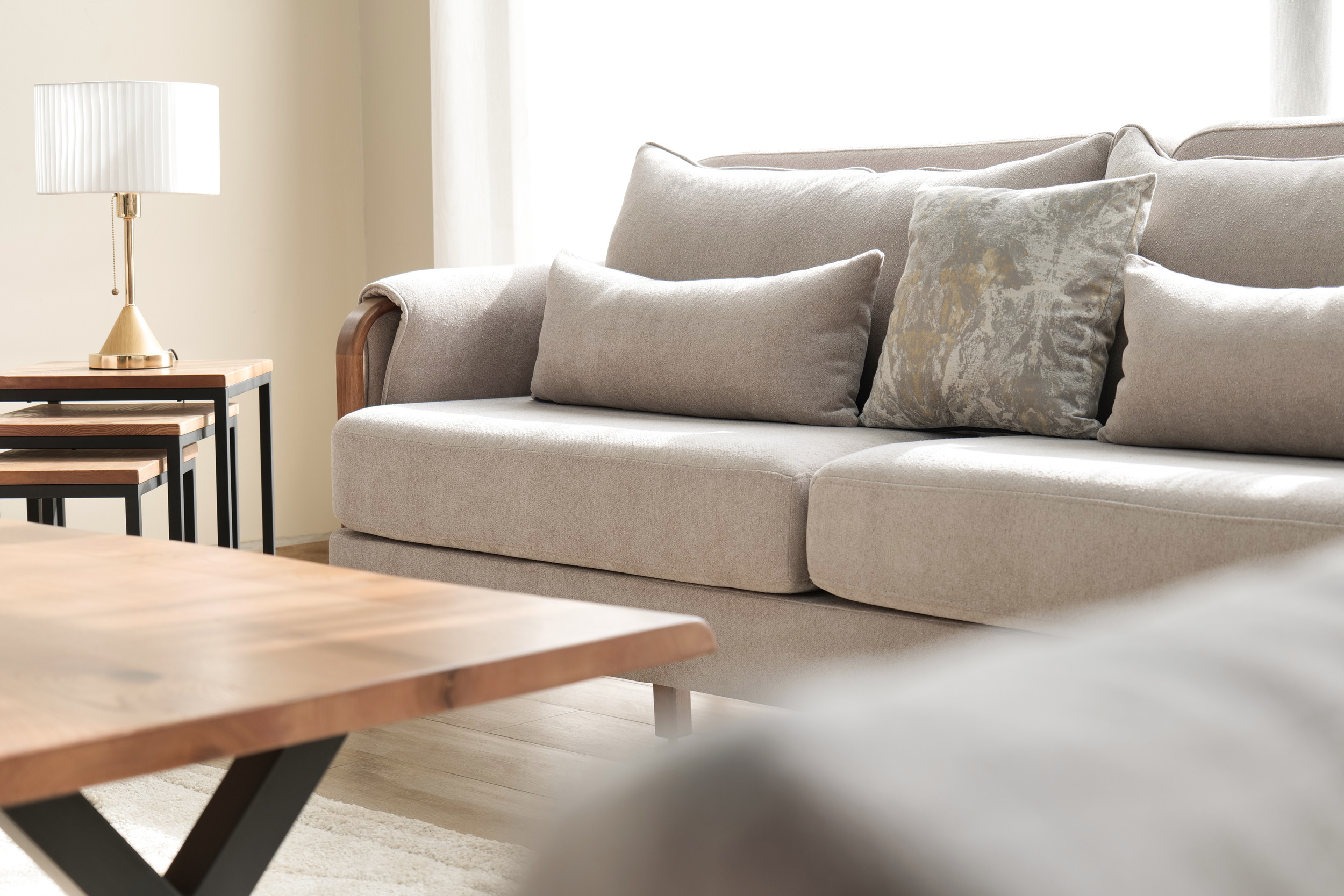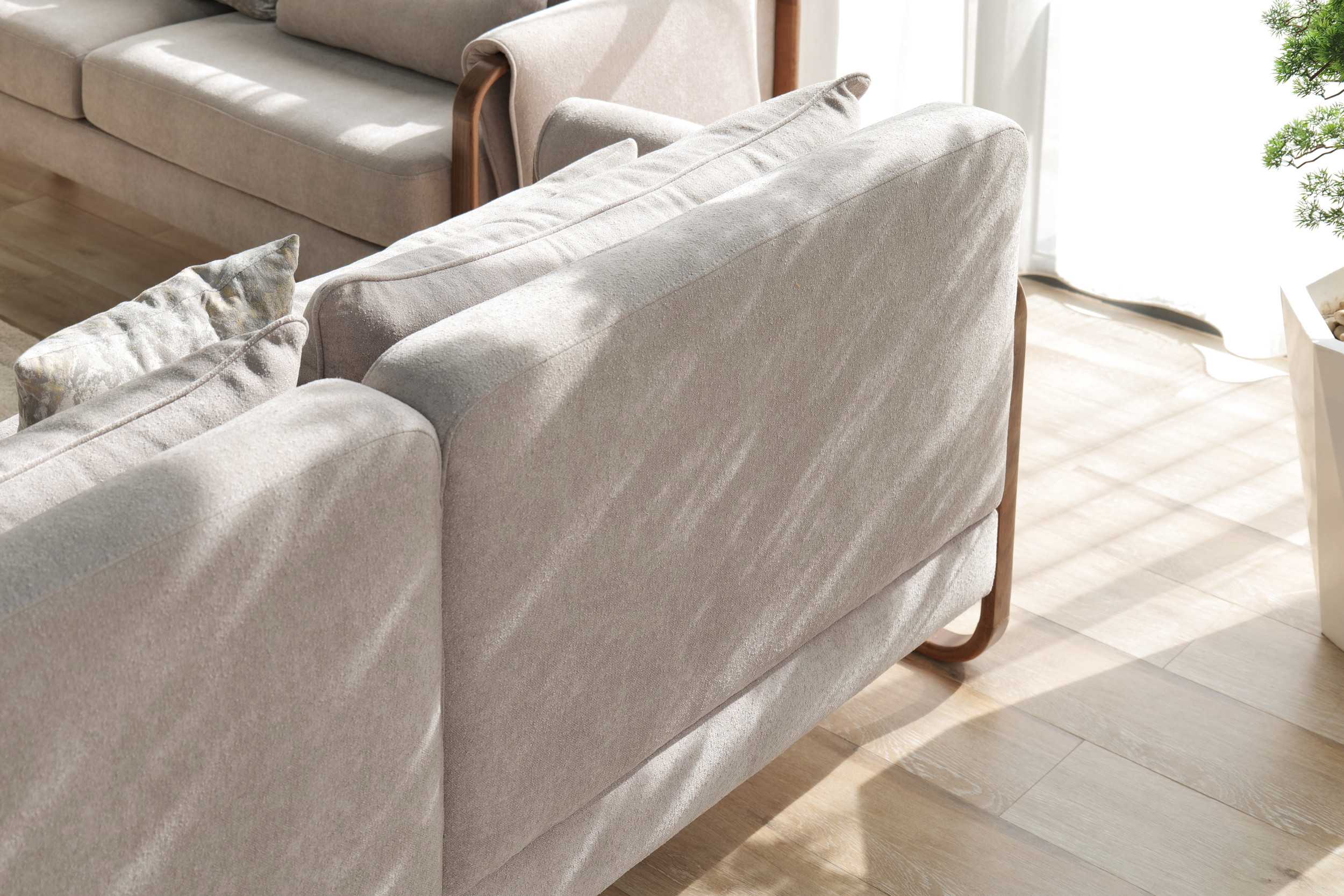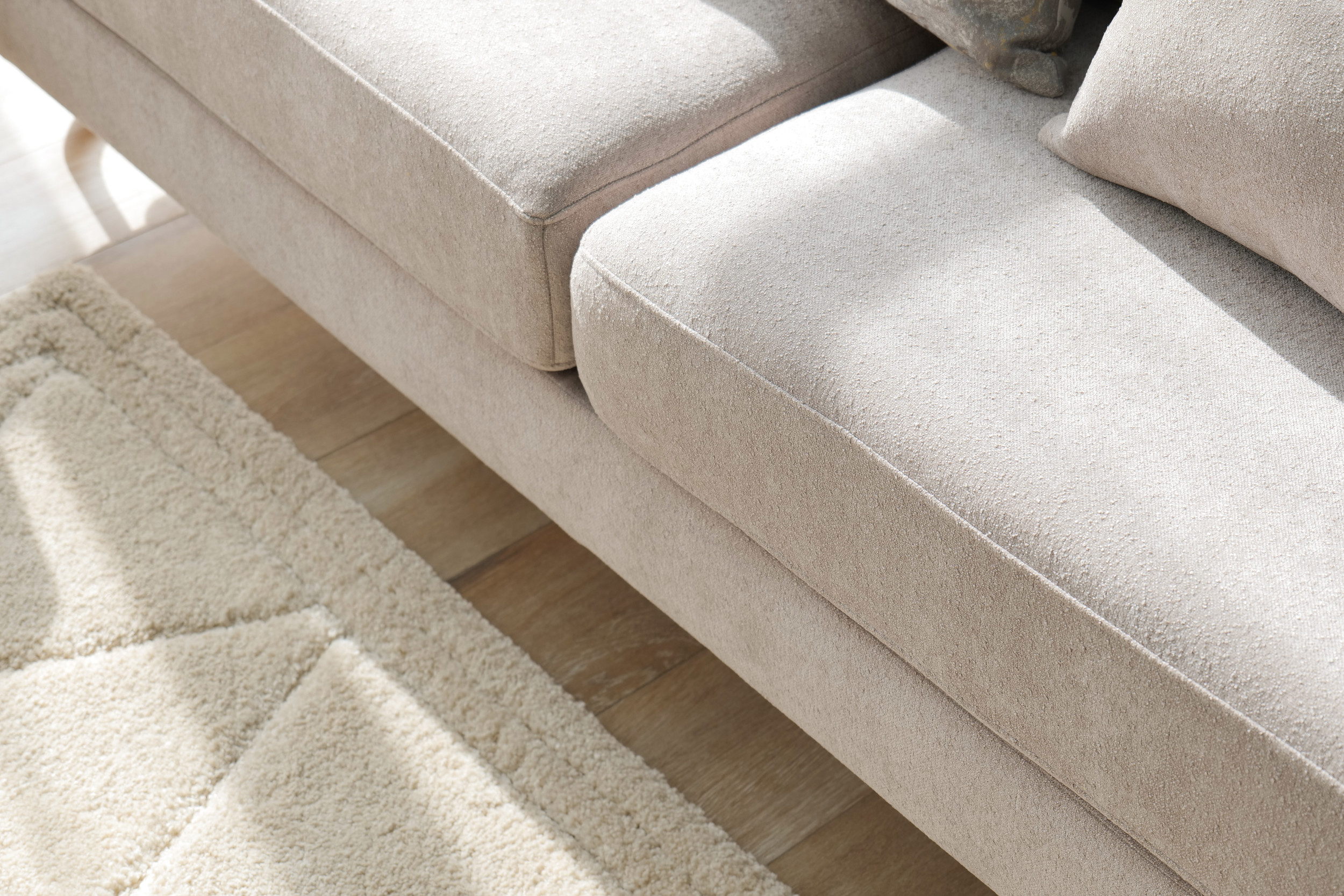 The cushions are plush and supportive, offering a balanced comfort that maintains its shape over time. The accent pillows complement the overall look with neutral textures and subtle patterns, adding depth without overwhelming the minimal design. Their presence reinforces the cozy, tranquil identity of the collection.