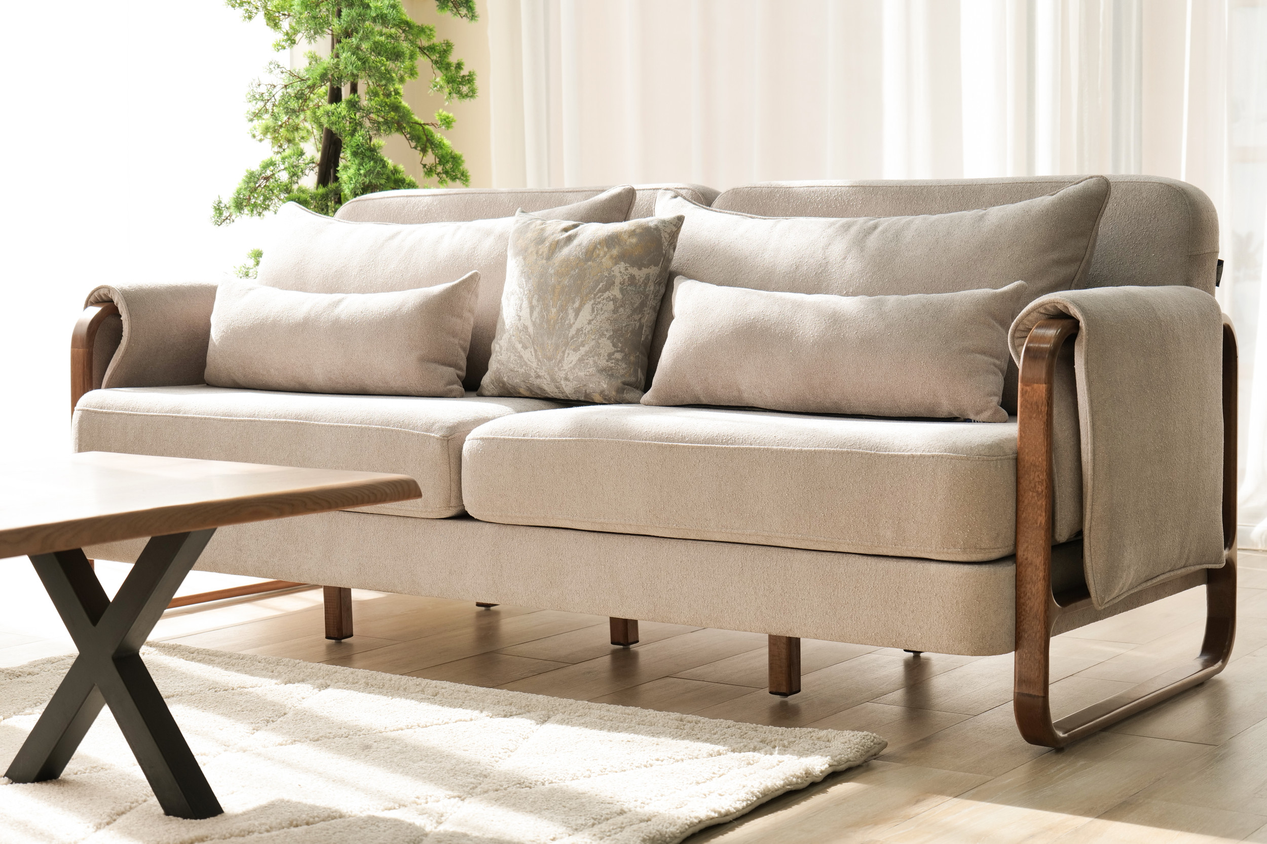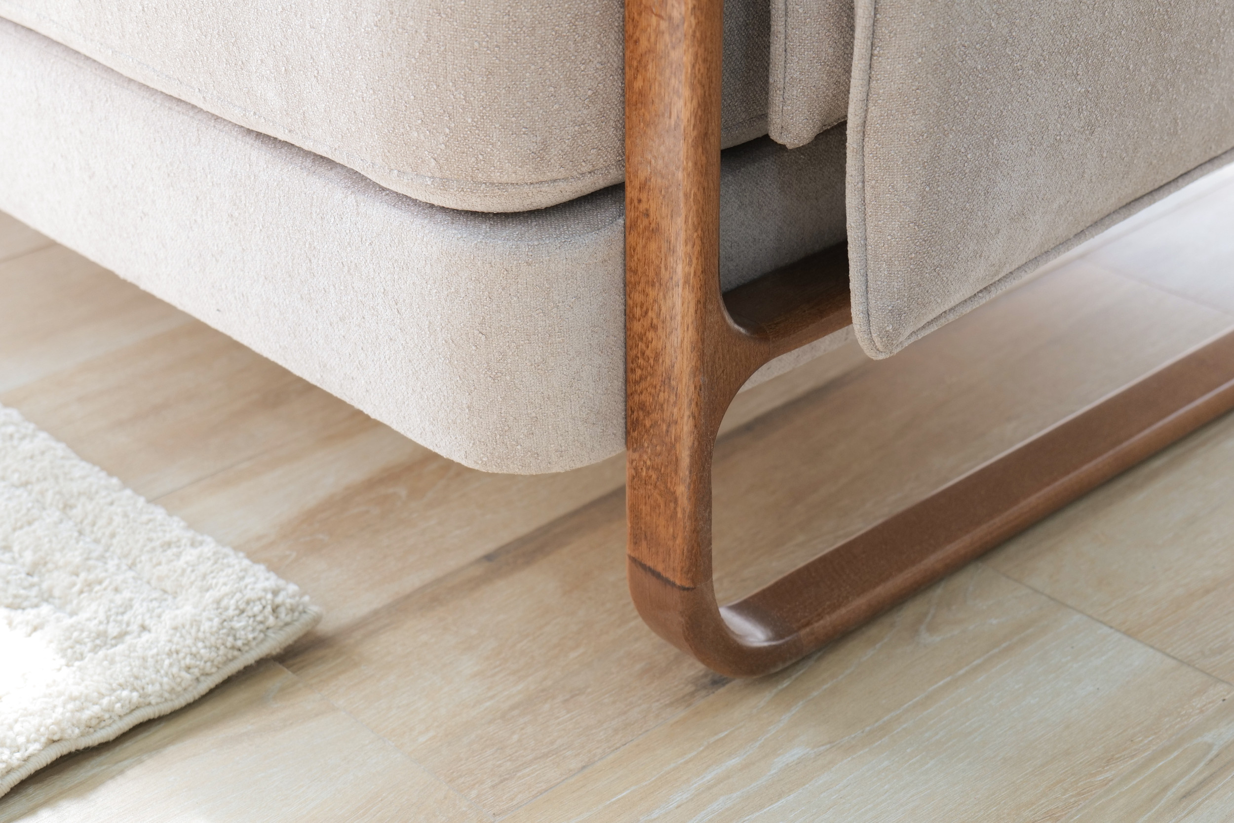 The legs are discreet, lightly elevated, and partially incorporated into the curved wooden structure. This design gives the sofa a floating appearance while preserving stability and strength.