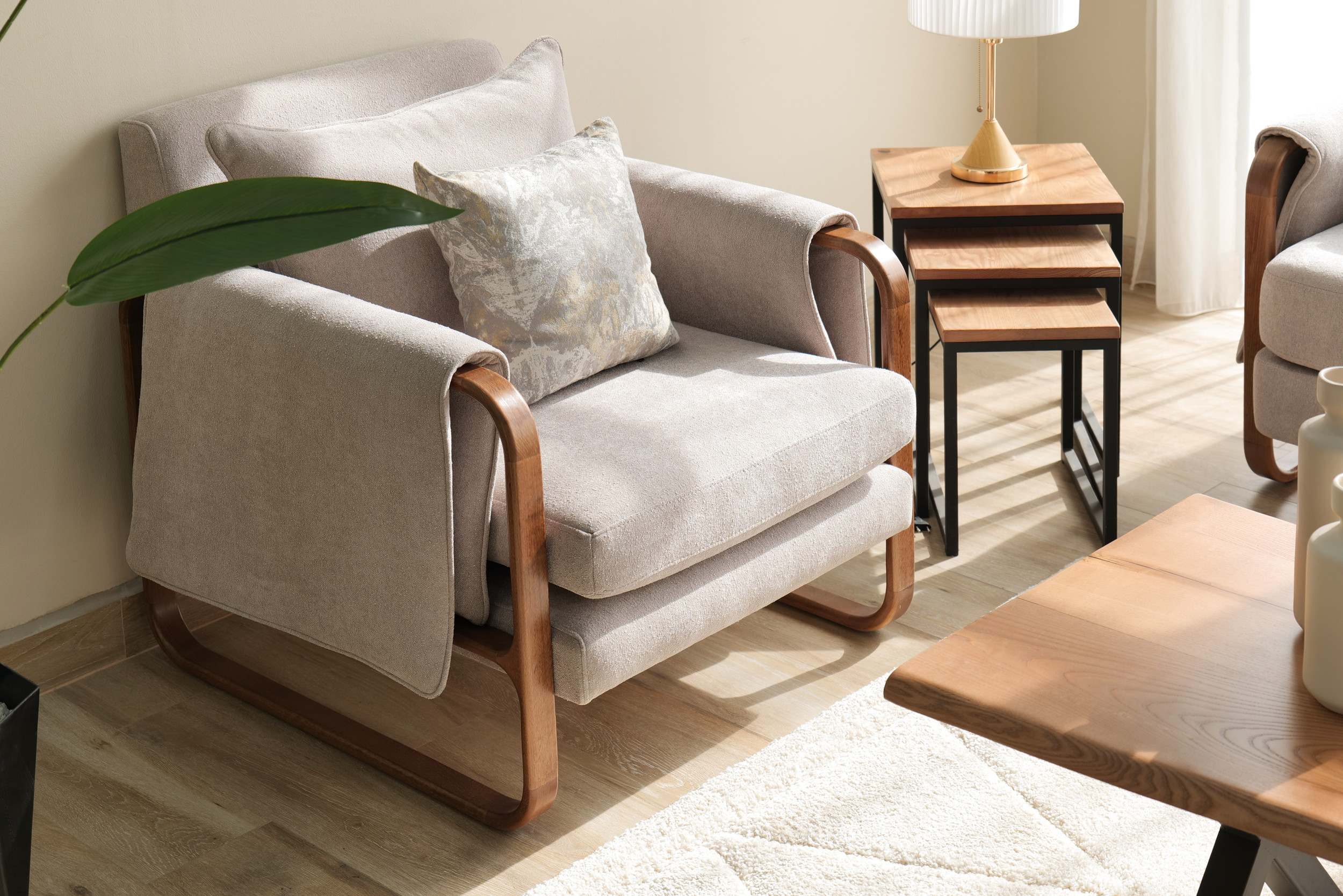 The armchair adopts the same curved-wood signature, functioning as both a seating piece and a decorative element. Its open-frame wooden silhouette and enveloping cushions create a perfect balance between elegance and comfort, making it suitable for standalone use or integration into the complete set.