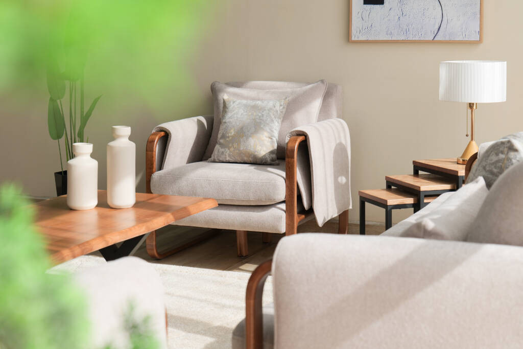 - A soft wool rug in ivory or sand tones to highlight the smooth wood curves