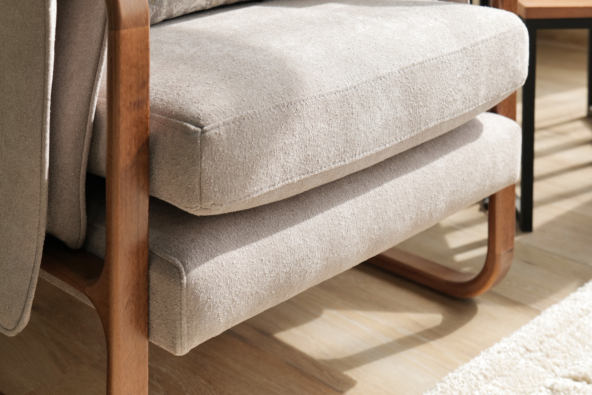 The structure is built on a sturdy, well-balanced frame, ensuring stability and long-term durability. Its distinctive wooden contour — smoothly bent around the armrests and base — highlights craftsmanship and adds a sculptural quality to the entire ensemble. The wood features a warm, natural finish that enhances the softness of the upholstery and strengthens the organic aesthetic.