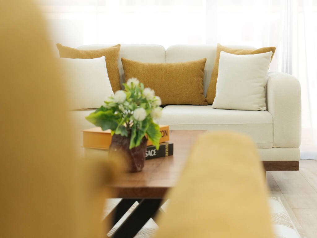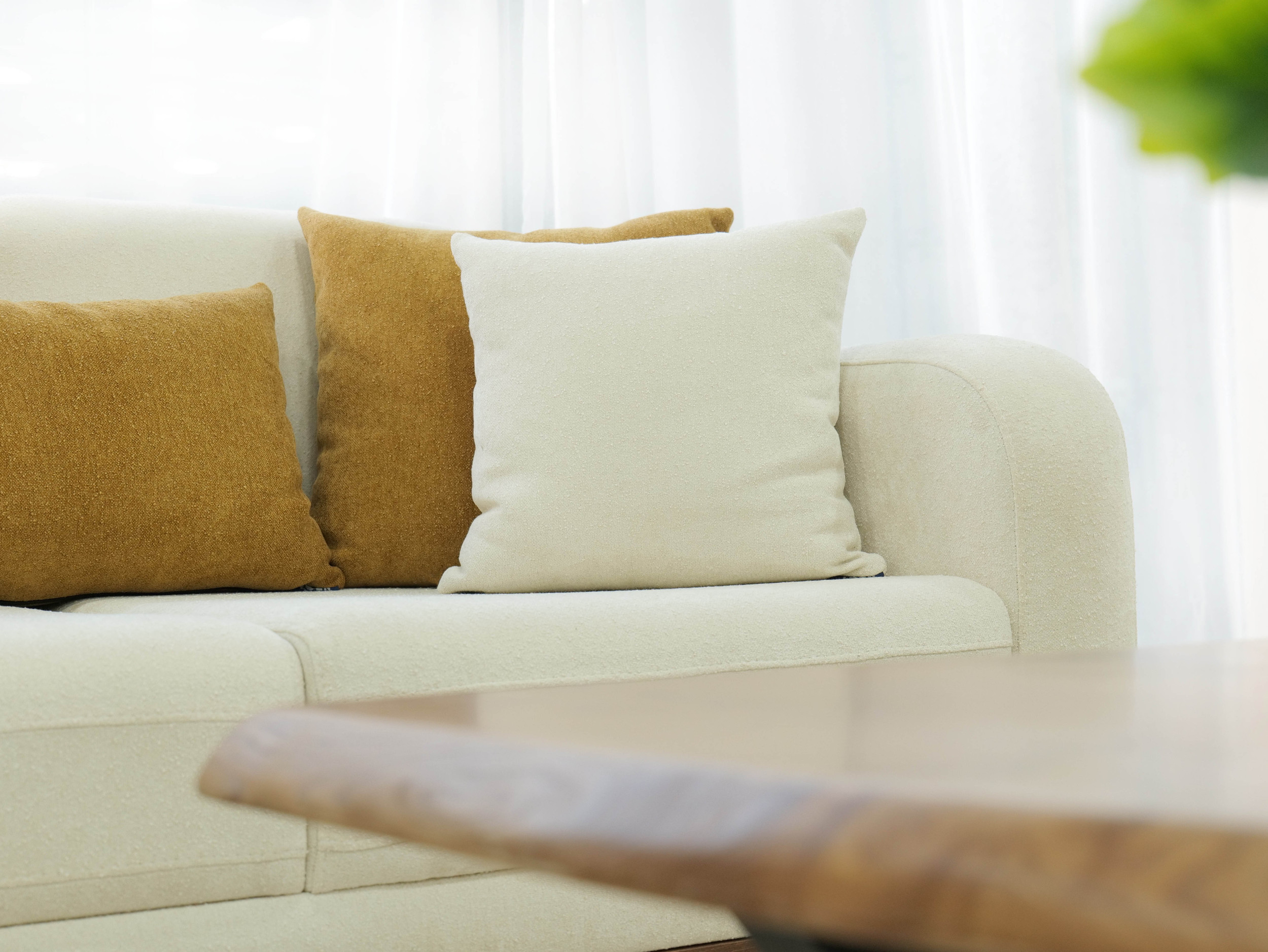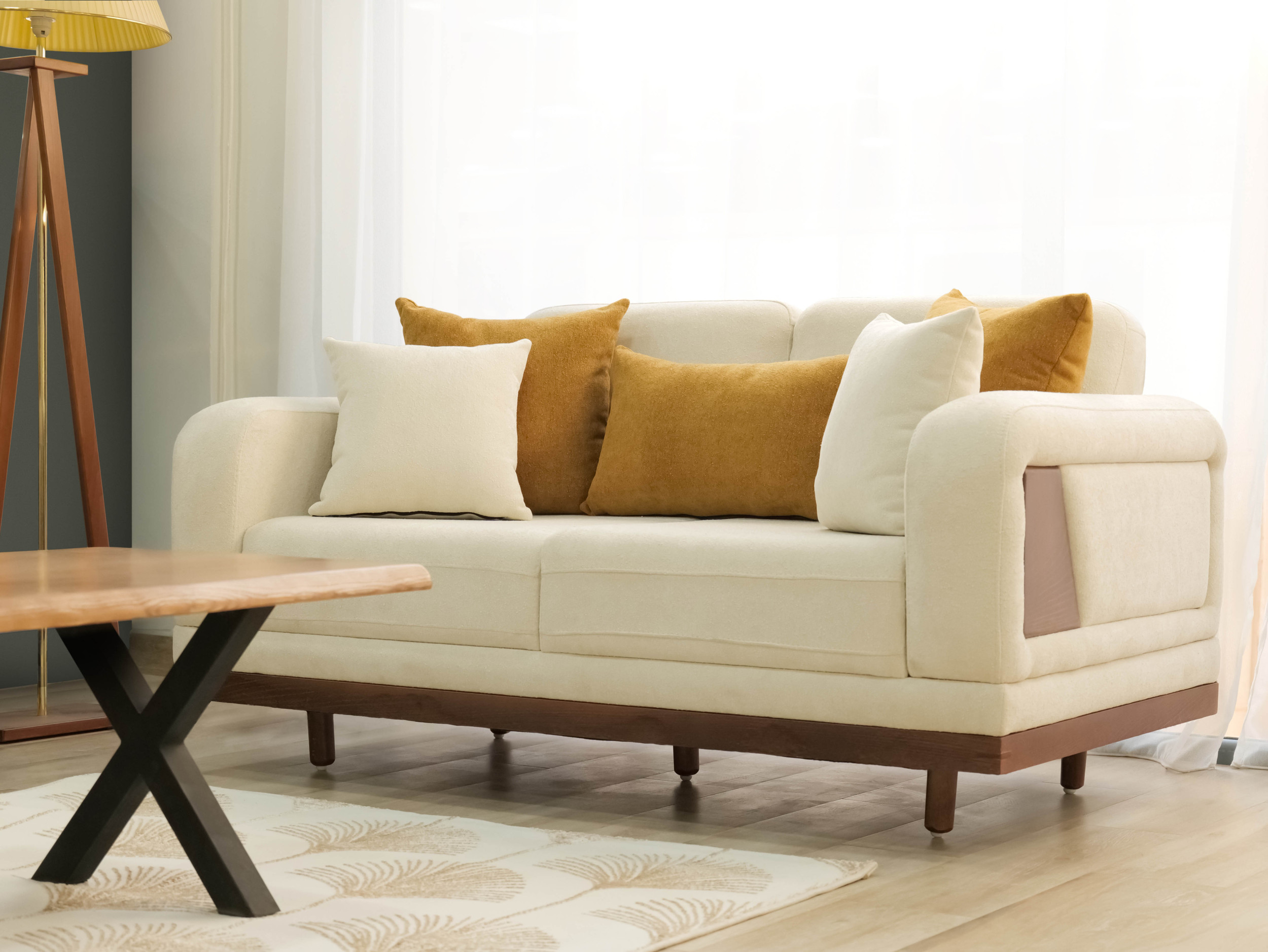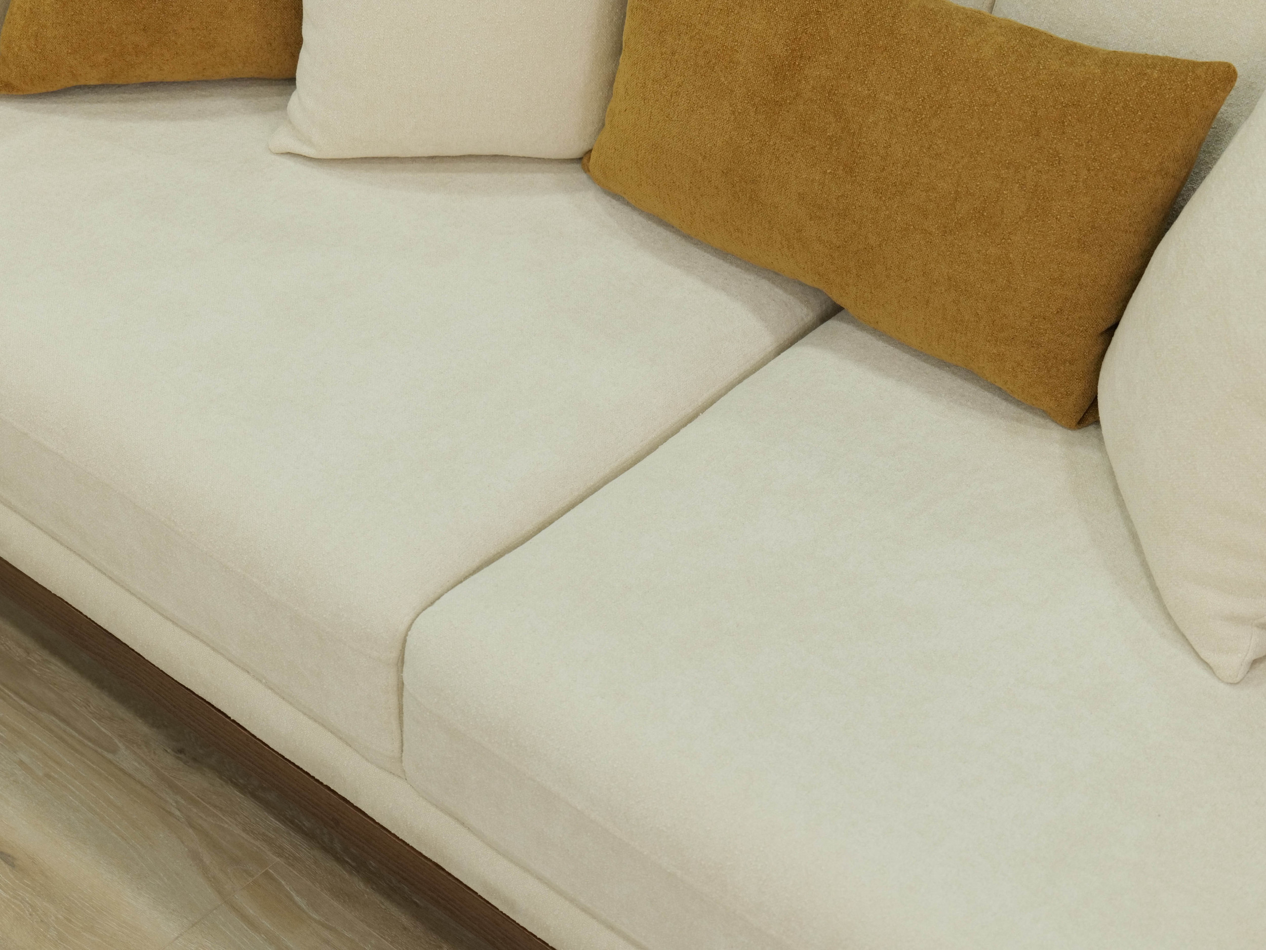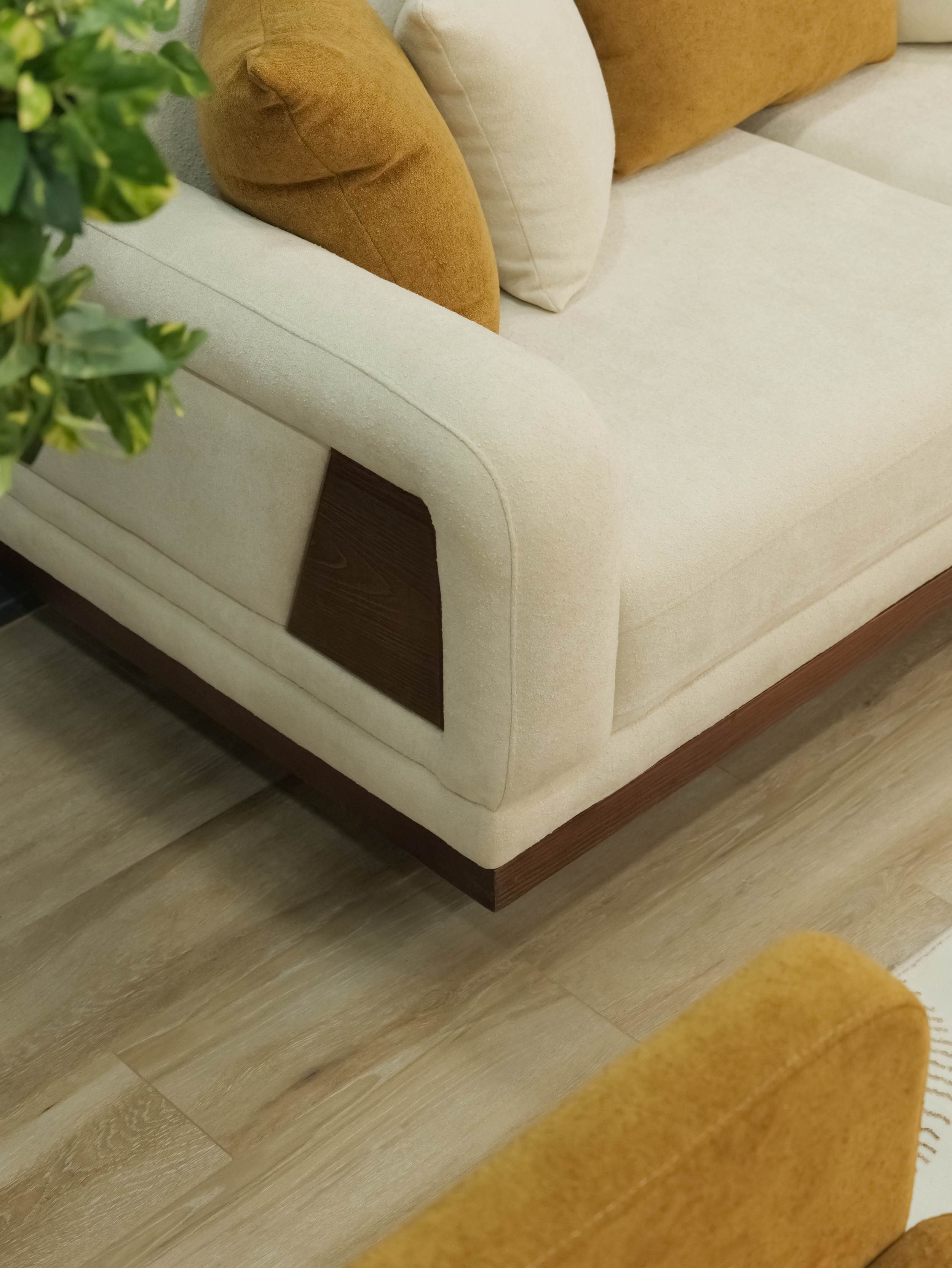 The upholstery features a smooth, creamy fabric that highlights LOTUS’s softness while maintaining a polished, modern appearance. Subtle stitched details and thoughtfully integrated side panels introduce a touch of craftsmanship, giving the sofa a distinctive yet understated personality. Plush seat and back cushions provide balanced support, while the accent pillows — in warm, nature-inspired tones — add depth and a sense of cozy sophistication.