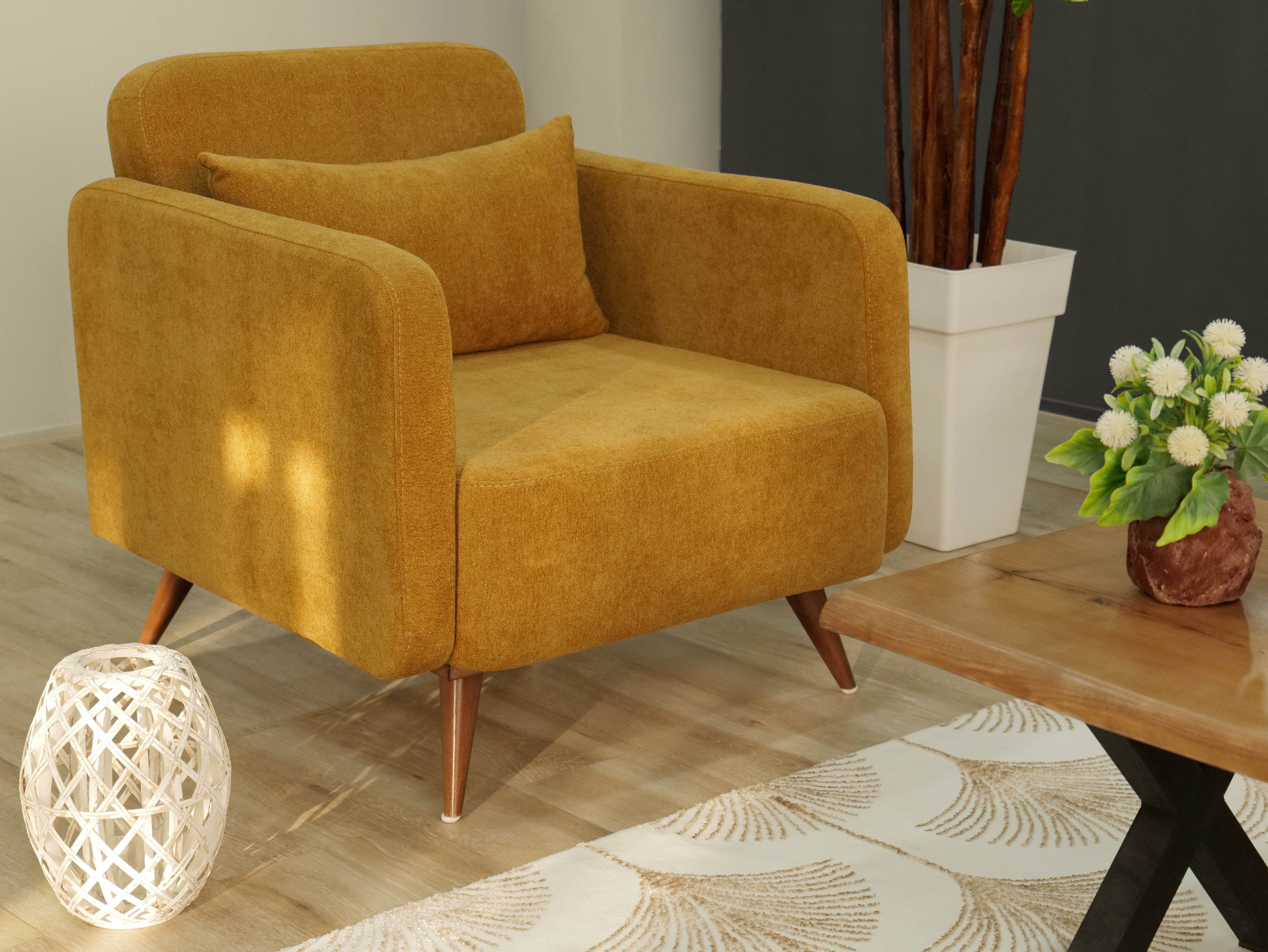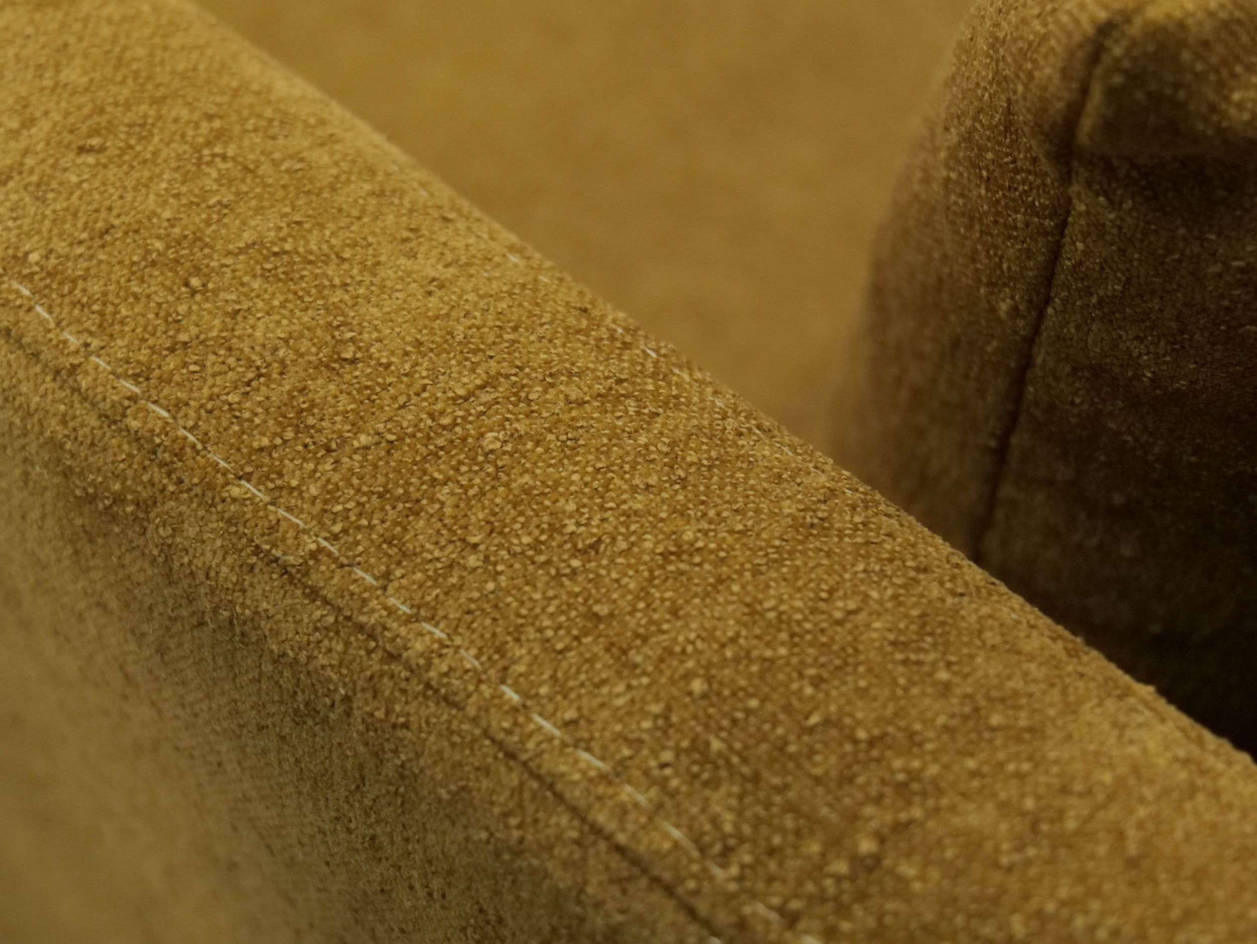The armchair mirrors the same enveloping form and warm palette, allowing it to stand confidently on its own or complement the full set. The collection as a whole captures a calm, inviting essence ideal for interiors that embrace natural warmth, organic inspiration, and gentle modernity.