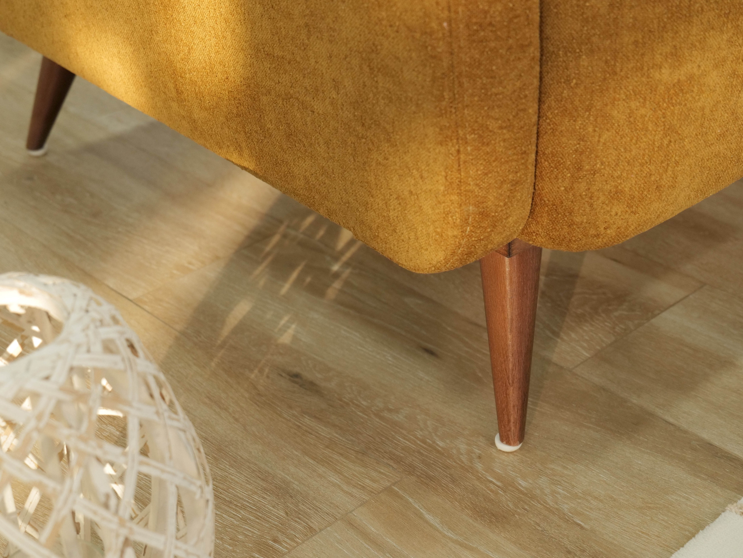 - A tall, minimalist floor lamp in brushed amber wood or matte brass
