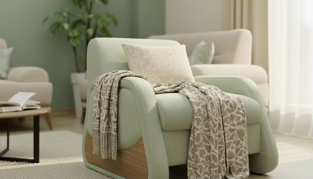 - A slim, softly arched floor lamp with a fabric shade for diffused, calming lighting