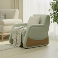The armchair echoes the same sculptural softness, combining curved lines, warm wood elements, and comfortable padding. As a standalone piece or part of the complete set, it brings harmony, cohesion, and a refined sense of ease to the room.
