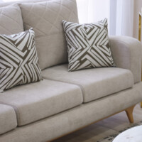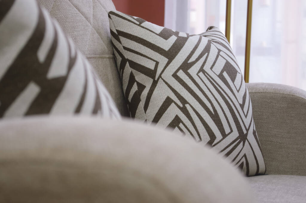 Boldly patterned accent pillows introduce a dynamic visual rhythm, contrasting beautifully with the serene upholstery. The light wooden base and tapered legs complete the look with a warm, airy foundation—bringing a sense of openness to any interior.