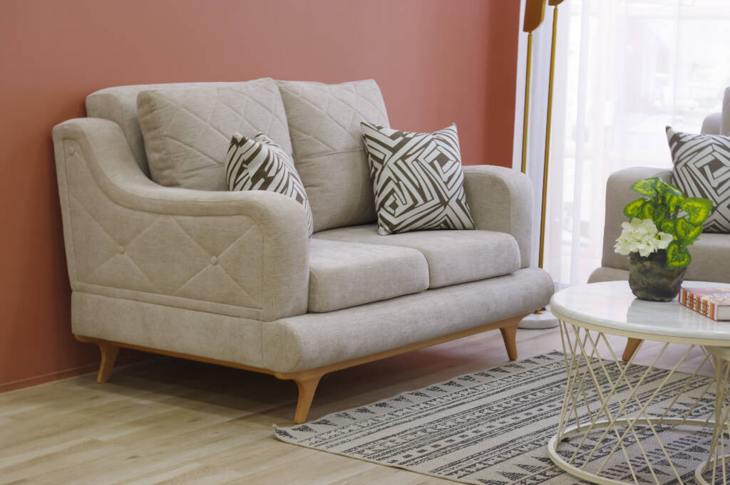 - A handwoven neutral-toned rug that enhances the sofa’s warmth while adding a subtle layer of texture