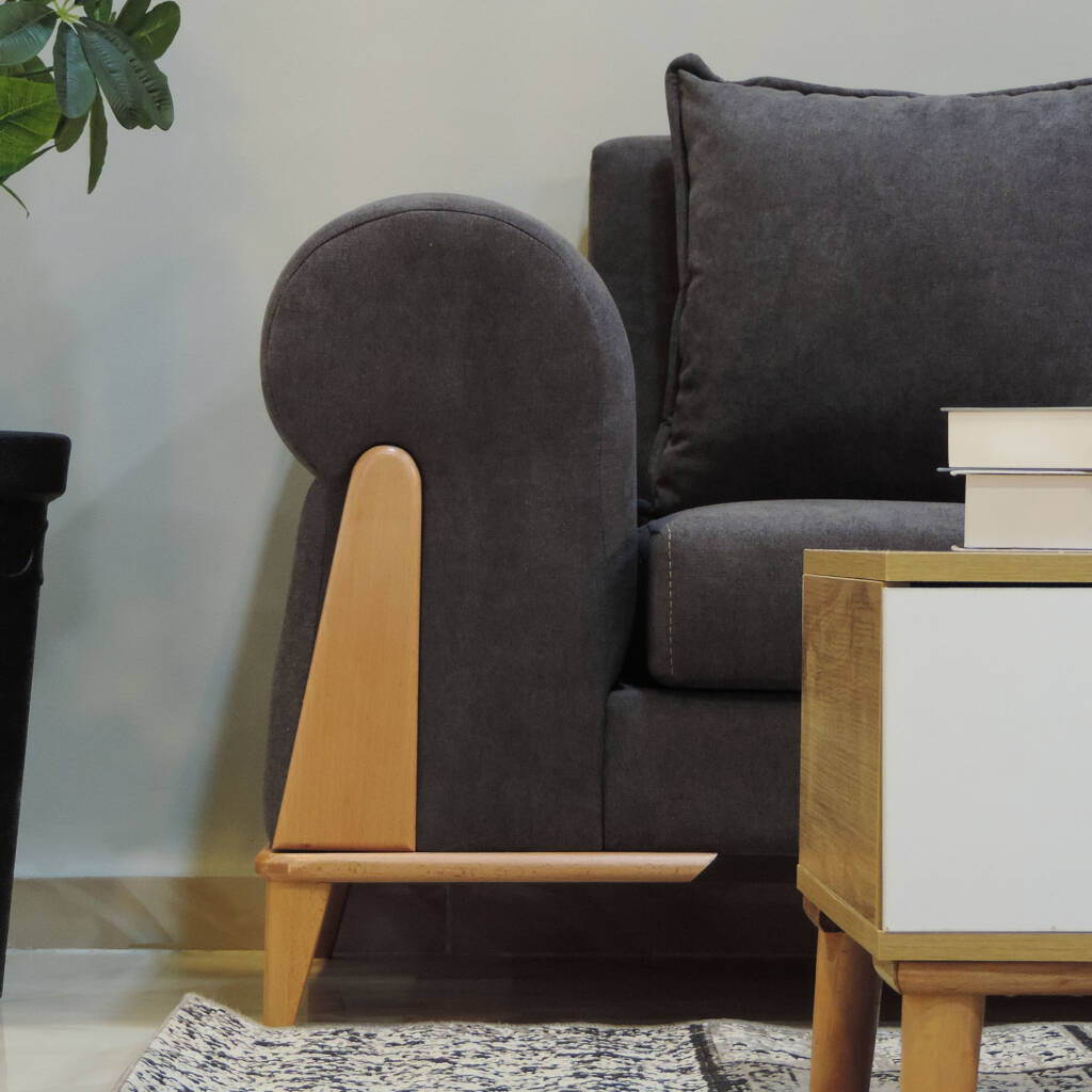 Les éléments en bois sont finis avec des bords lisses et un ton naturel, s’étendant subtilement dans les pieds, qui sont légèrement surélevés et effilés. Cette élévation allège la masse globale du canapé d’angle tout en préservant la stabilité et la résistance.