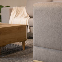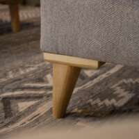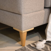 Des éléments en bois sont discrètement intégrés dans les pieds, qui sont légèrement surélevés et effilés. Cette élévation allège visuellement le canapé d’angle, améliore la circulation au sol et renforce le caractère moderne de l’ensemble tout en assurant la stabilité.