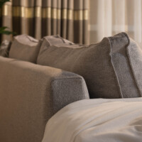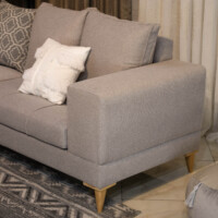 Les coussins d’assise sont généreusement rembourrés, offrant un soutien et un confort constants pour une utilisation quotidienne. Un arrangement coordonné de coussins ajoute de la texture et de la profondeur visuelle, combinant des surfaces lisses avec des motifs subtils. Cet équilibre améliore l’esthétique du canapé tout en conservant un aspect calme et cohérent.