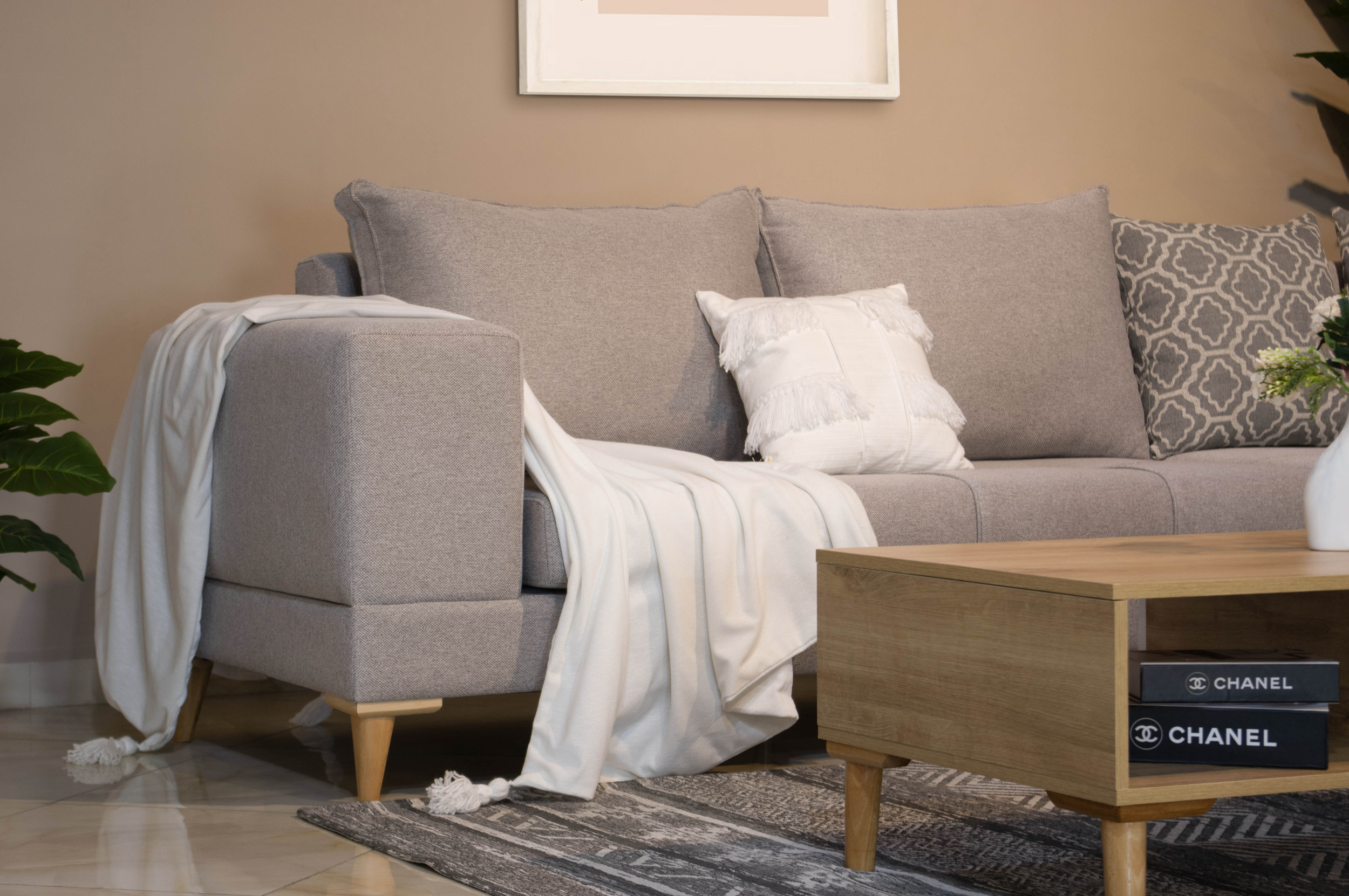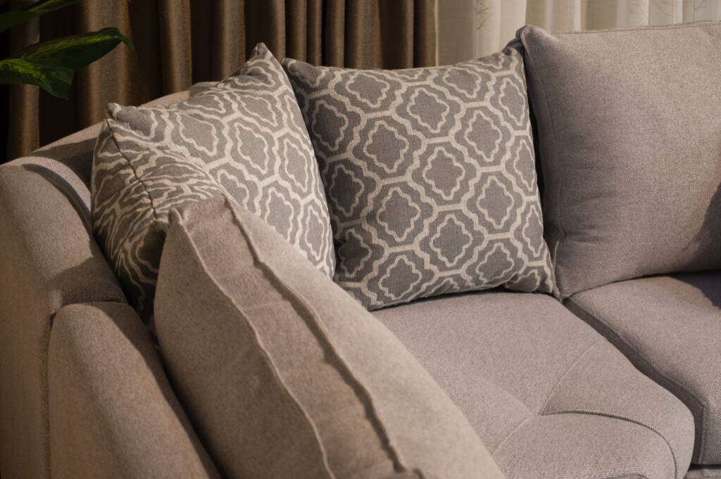Les coussins d’assise sont généreusement rembourrés, offrant un soutien et un confort constants pour une utilisation quotidienne. Un arrangement coordonné de coussins ajoute de la texture et de la profondeur visuelle, combinant des surfaces lisses avec des motifs subtils. Cet équilibre améliore l’esthétique du canapé tout en conservant un aspect calme et cohérent.