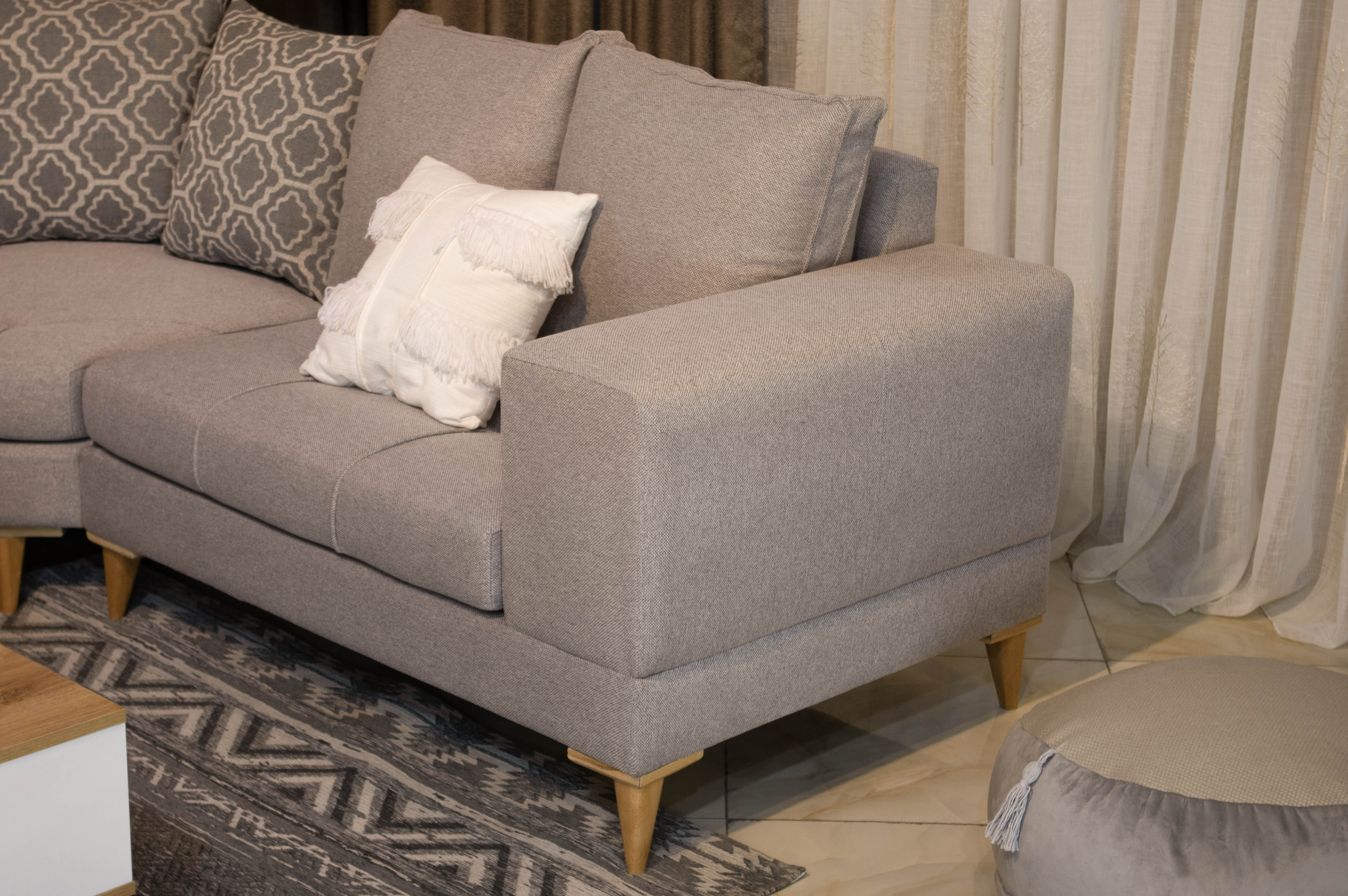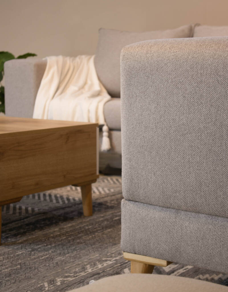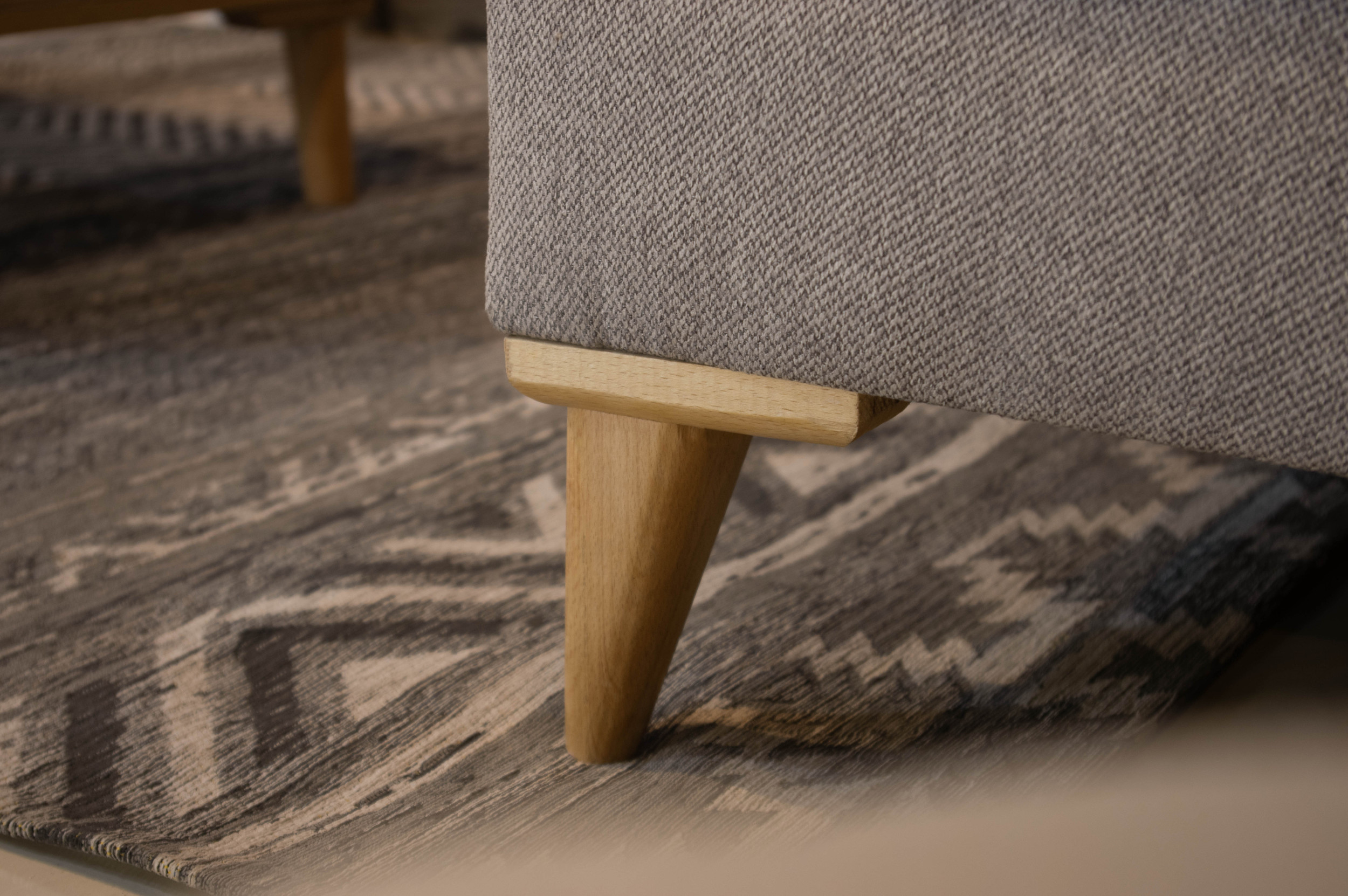 Des éléments en bois sont discrètement intégrés dans les pieds, qui sont légèrement surélevés et effilés. Cette élévation allège visuellement le canapé d’angle, améliore la circulation au sol et renforce le caractère moderne de l’ensemble tout en assurant la stabilité.