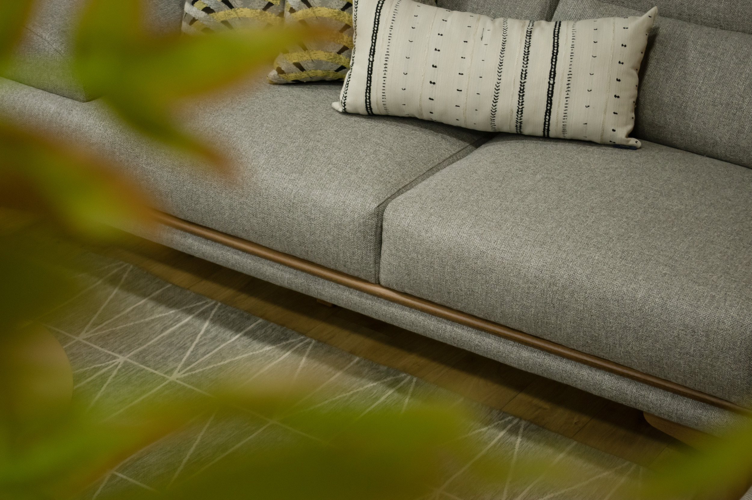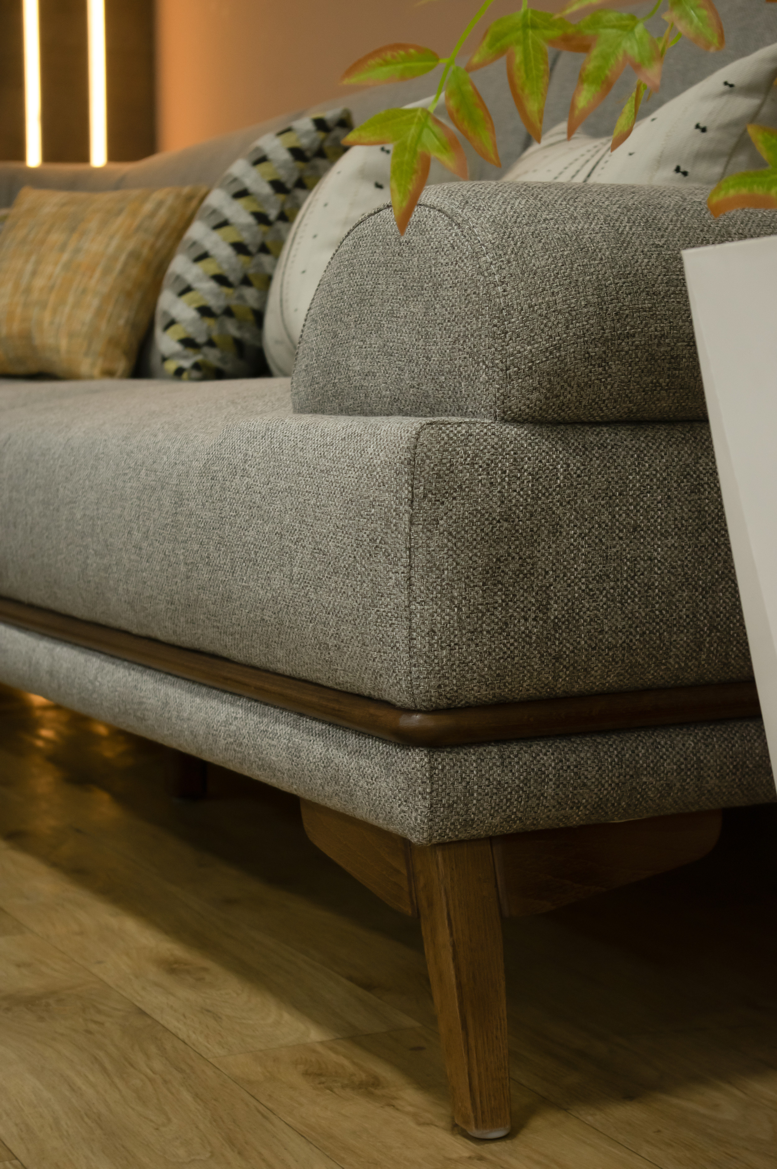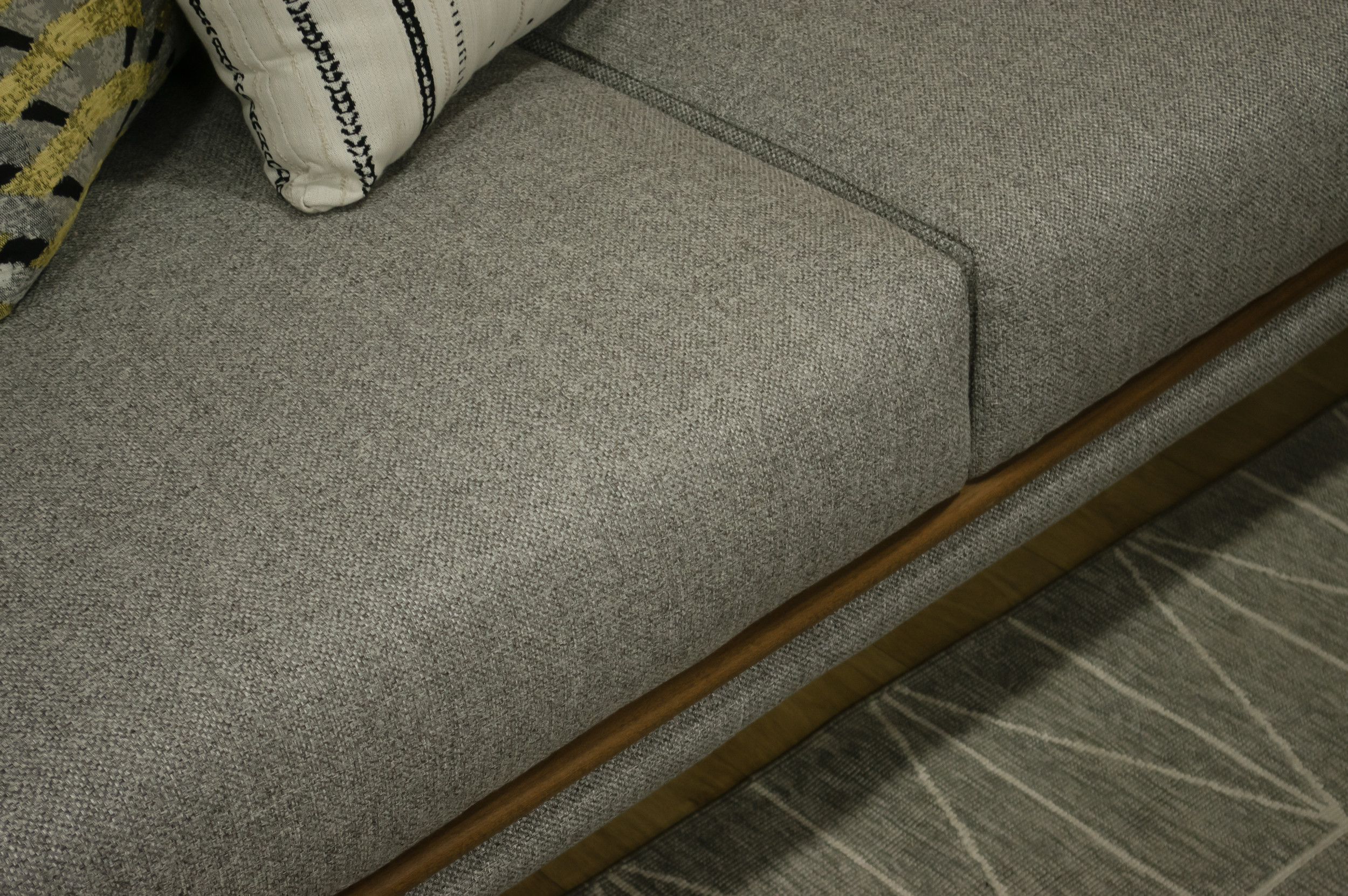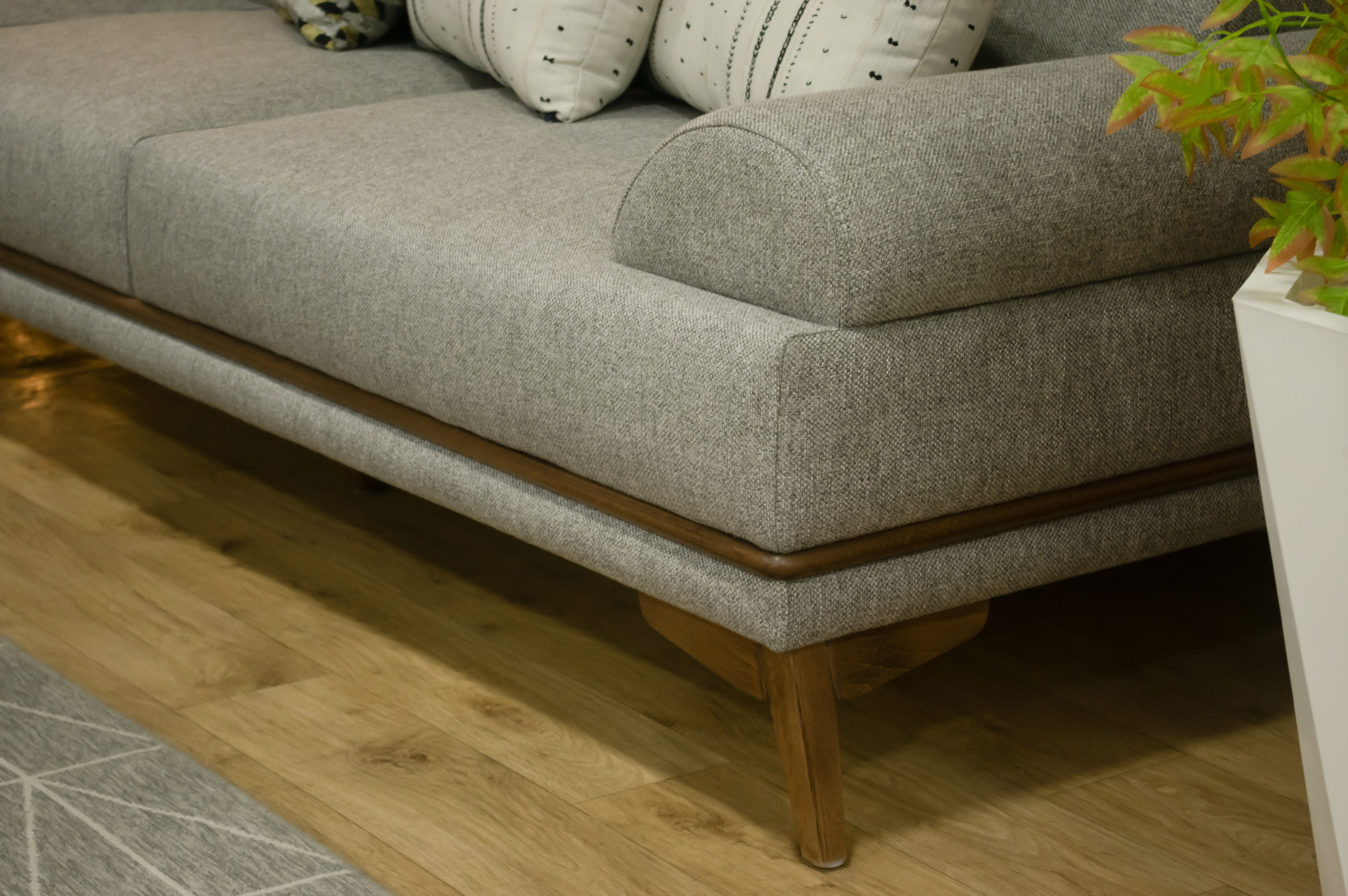 Le canapé est surélevé sur des pieds en bois massif avec une finition naturelle, ajoutant chaleur et contraste au revêtement. Cette base surélevée allège la masse visuelle de la configuration d’angle, améliore la circulation de l’air autour du canapé et renforce son caractère contemporain tout en assurant sa durabilité.