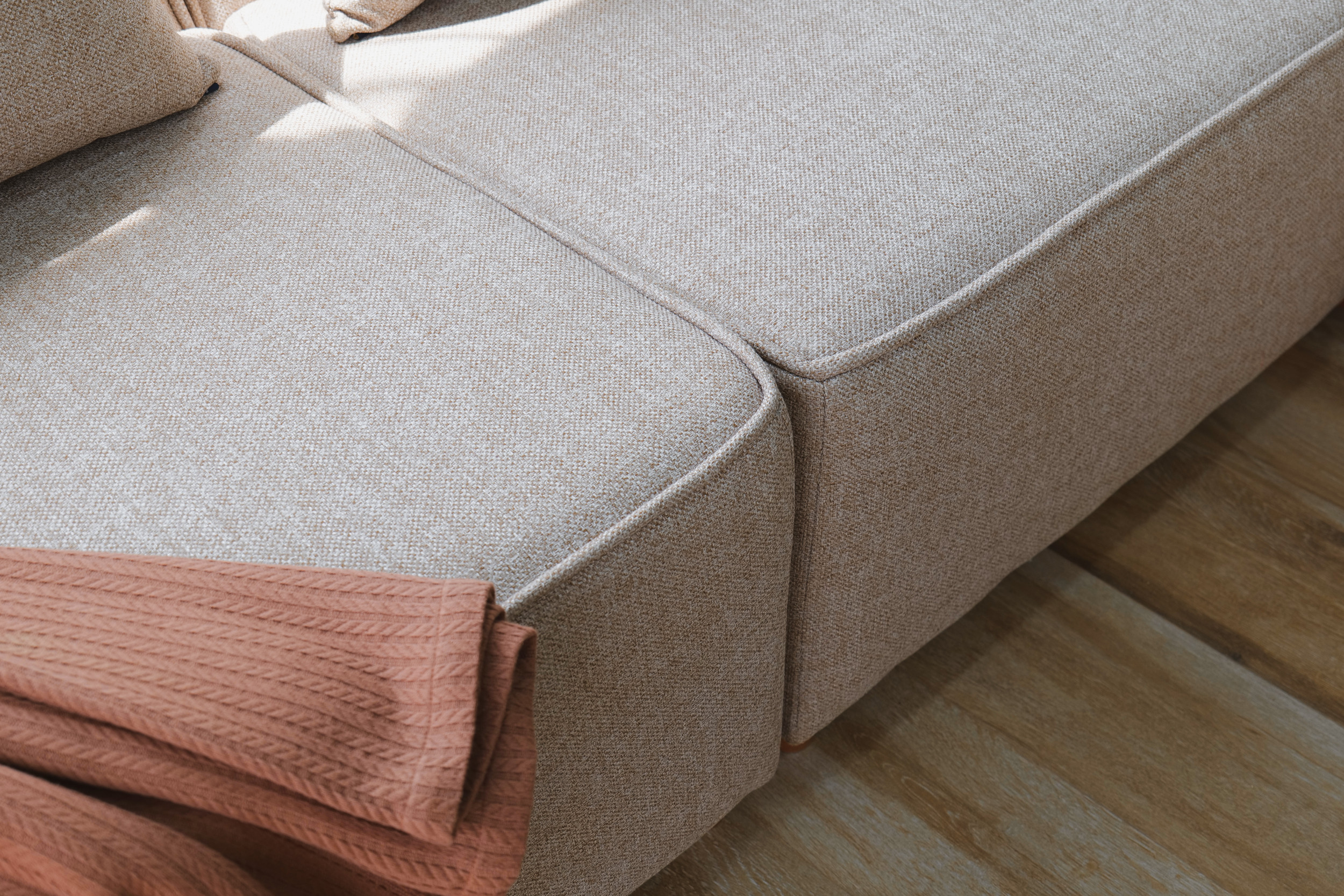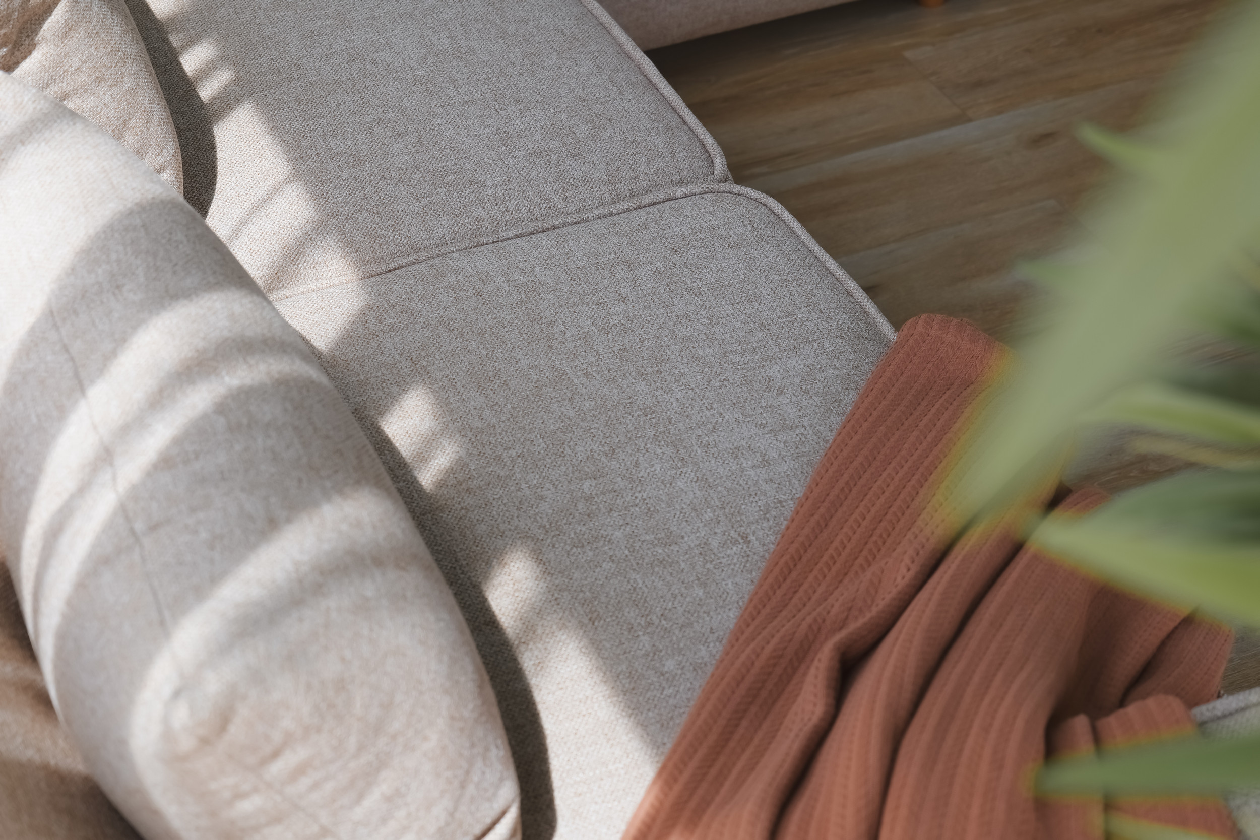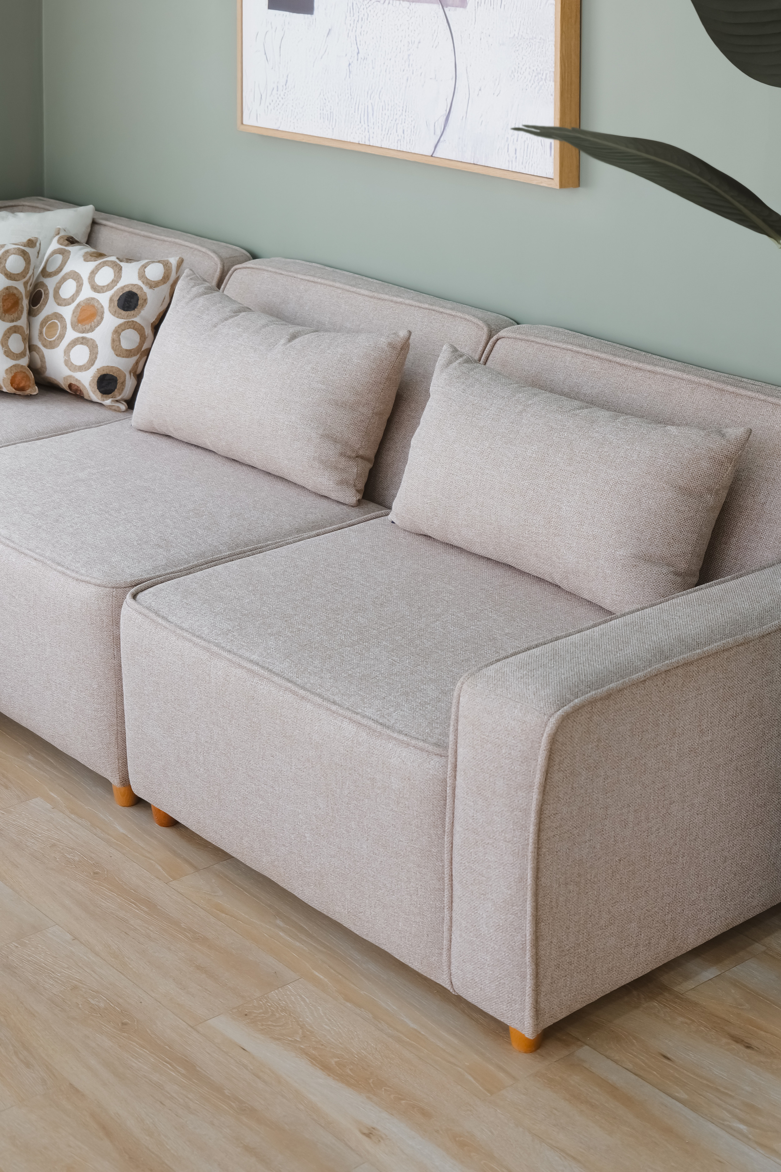 Le confort est au cœur du salon NIHED. Les coussins d’assise profonds offrent un soutien constant pour une utilisation quotidienne, tandis que les coussins de dossier moelleux favorisent une posture détendue. Les coussins décoratifs introduisent un contraste chaleureux et un rythme visuel, ajoutant de la profondeur sans dominer la palette neutre du canapé.