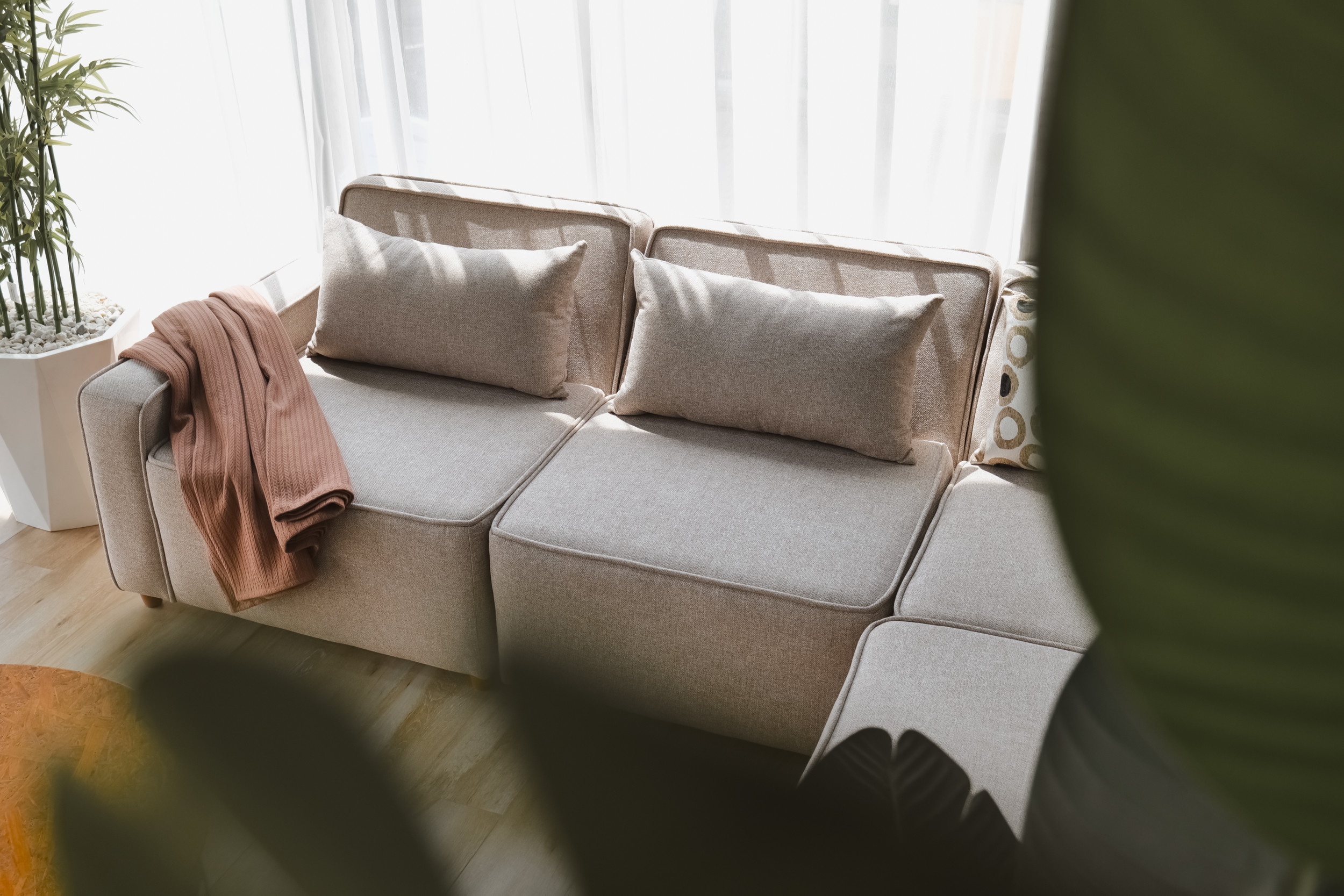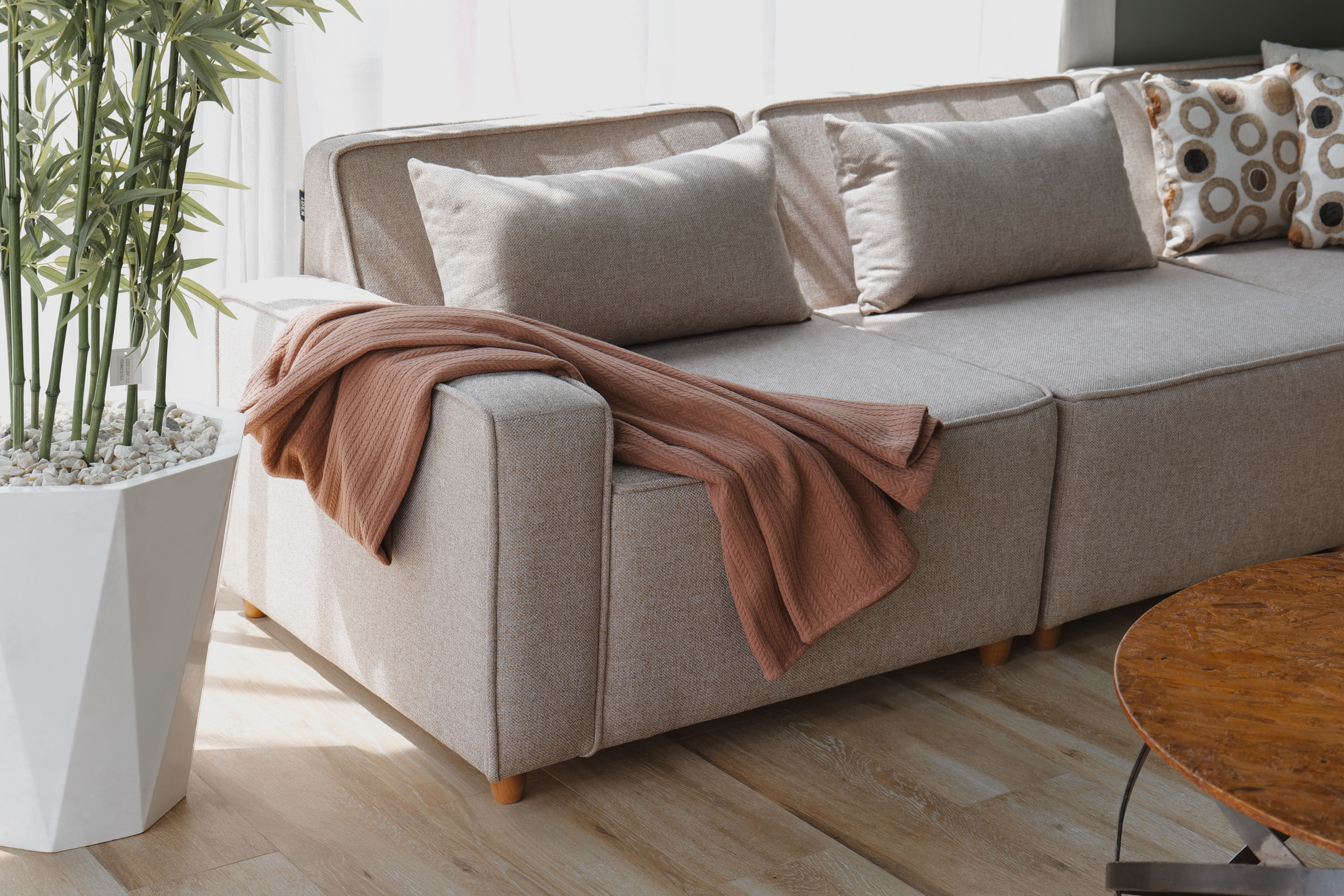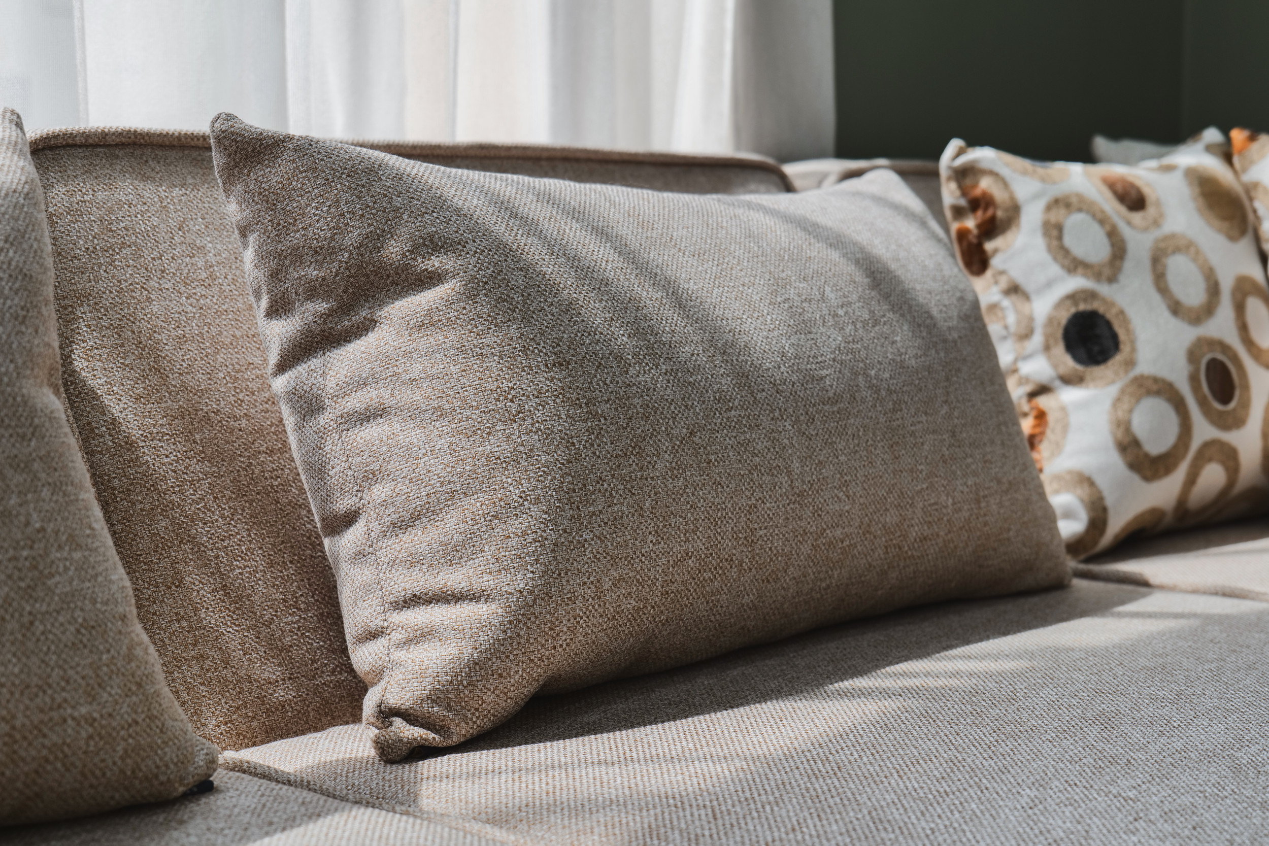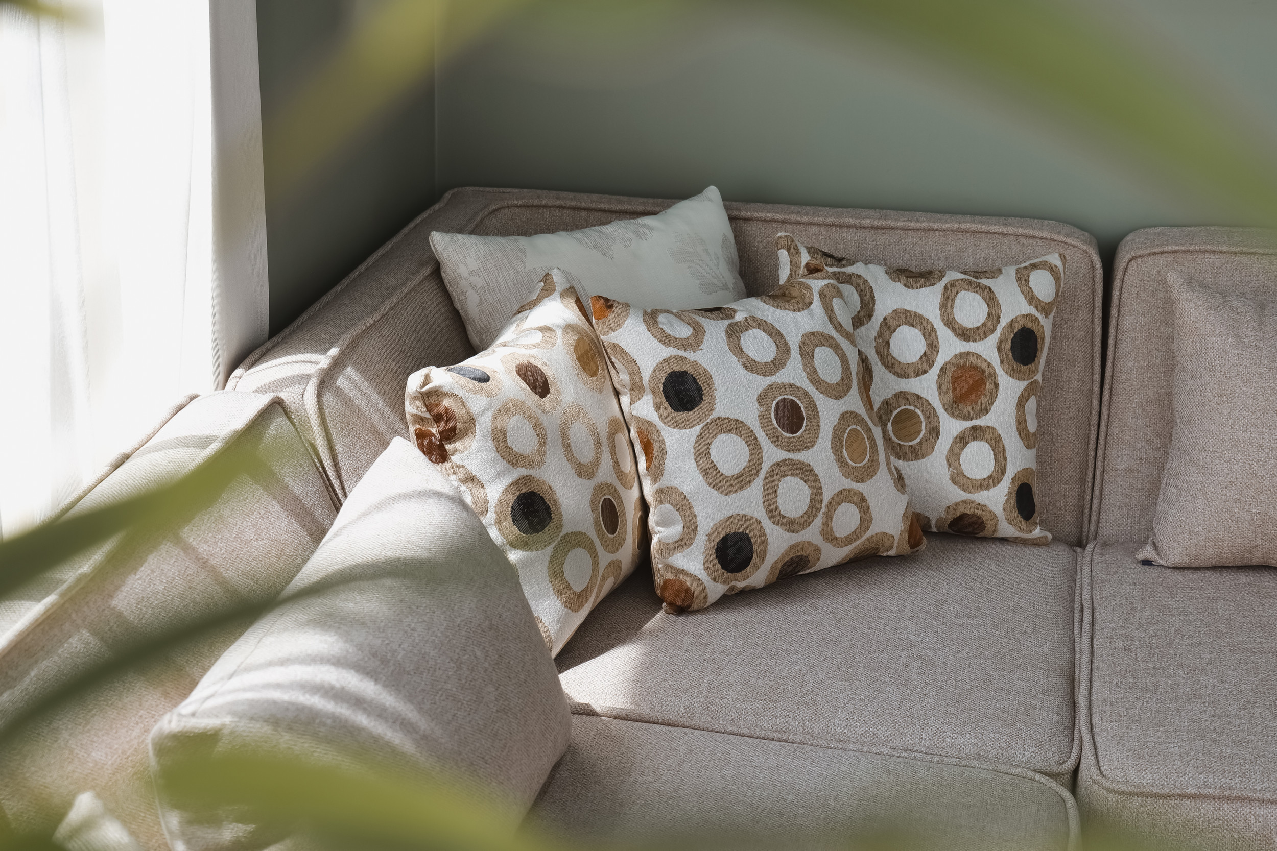 Le confort est au cœur du salon NIHED. Les coussins d’assise profonds offrent un soutien constant pour une utilisation quotidienne, tandis que les coussins de dossier moelleux favorisent une posture détendue. Les coussins décoratifs introduisent un contraste chaleureux et un rythme visuel, ajoutant de la profondeur sans dominer la palette neutre du canapé.