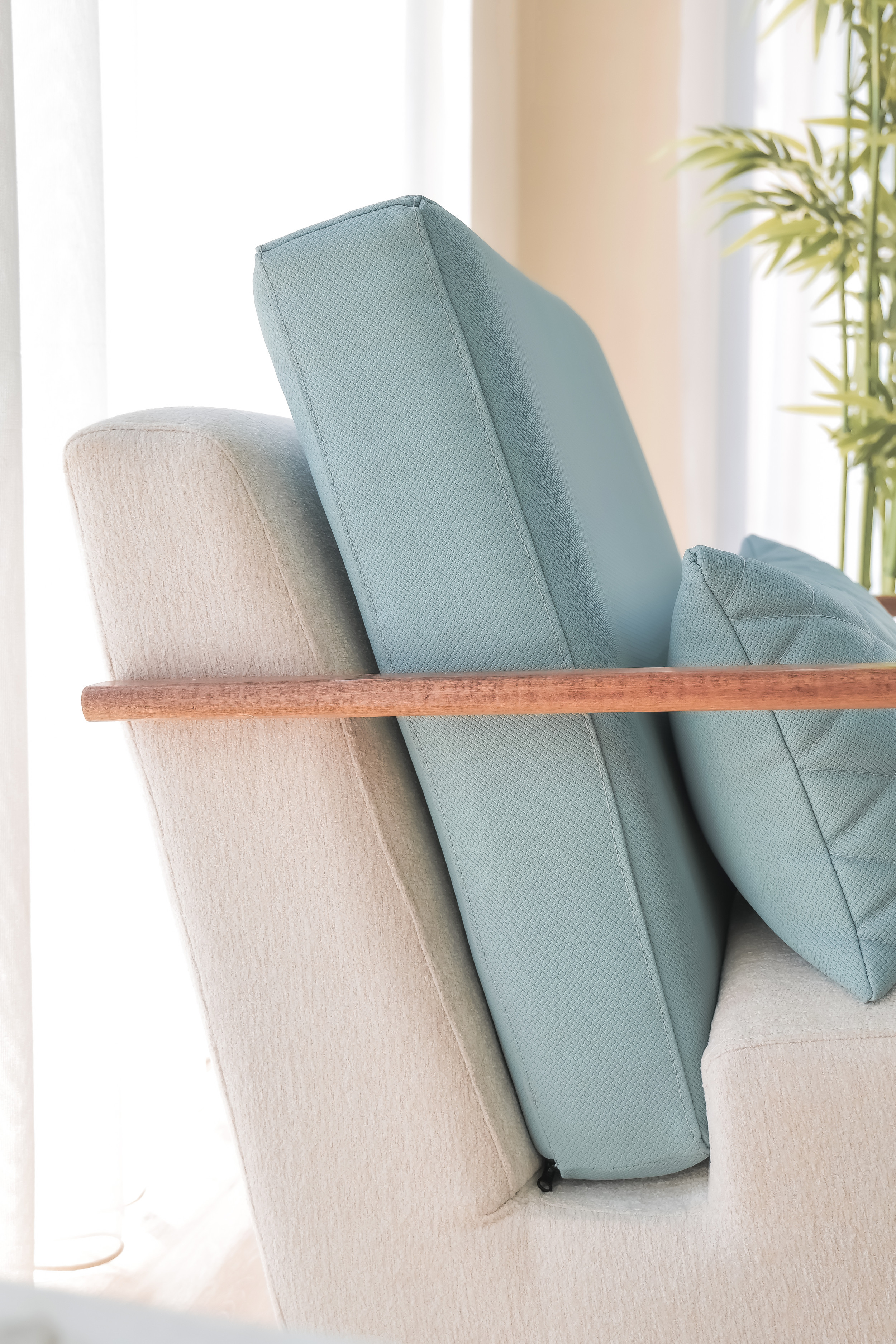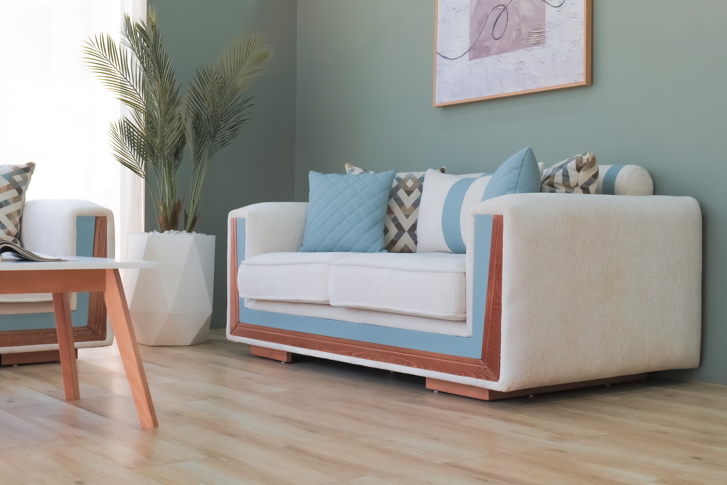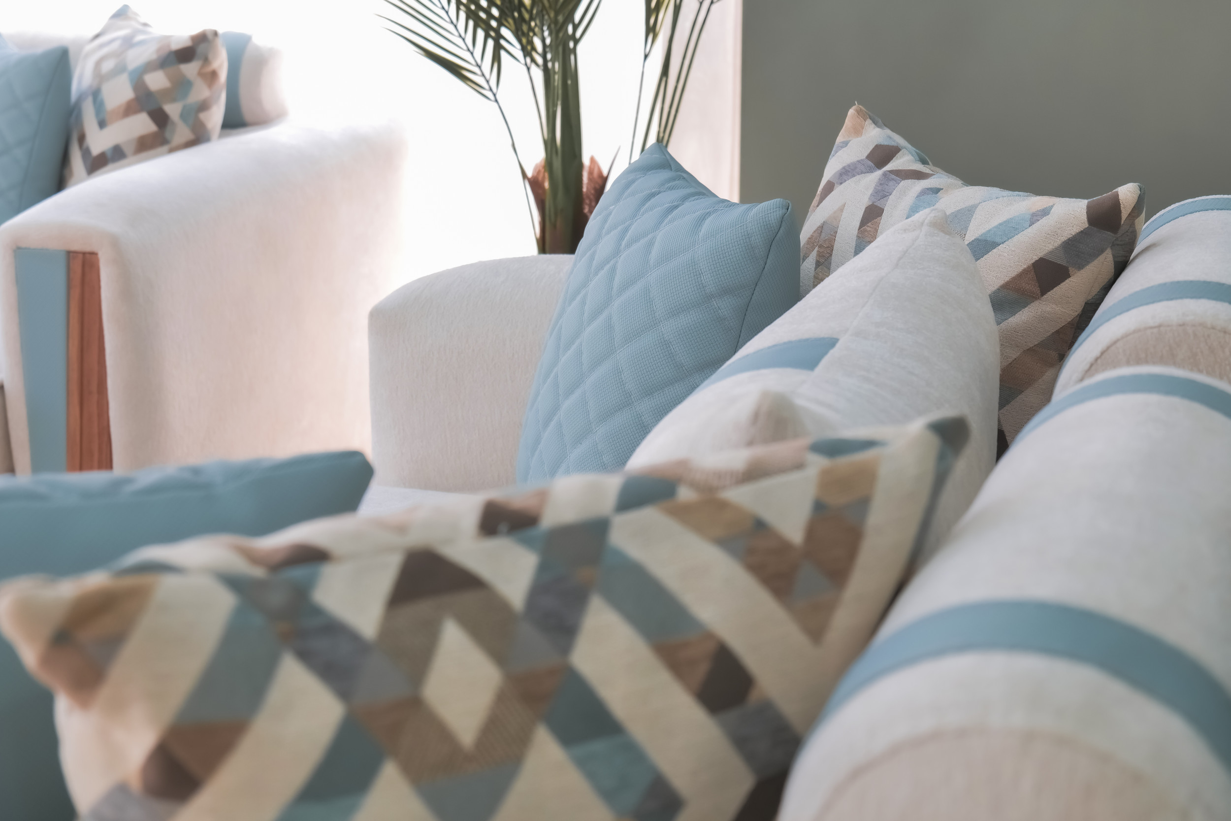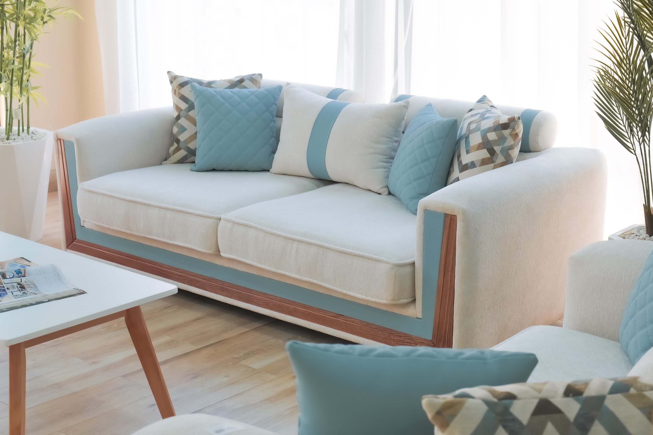 Le mélange harmonieux de tissu clair et de touches de bleu froid introduit une énergie rafraîchissante d’inspiration côtière : calme, aérée et délicieusement moderne. La profondeur d’assise généreuse et les coussins de dossier offrent un confort décontracté, tandis que les coussins géométriques offrent un contrepoint visuel vivant qui rehausse le design général.
