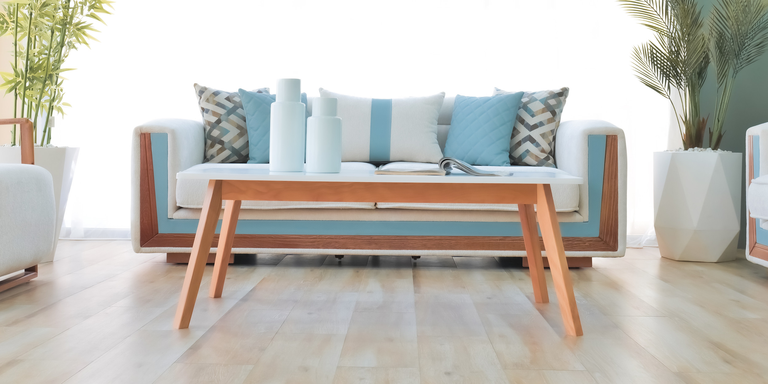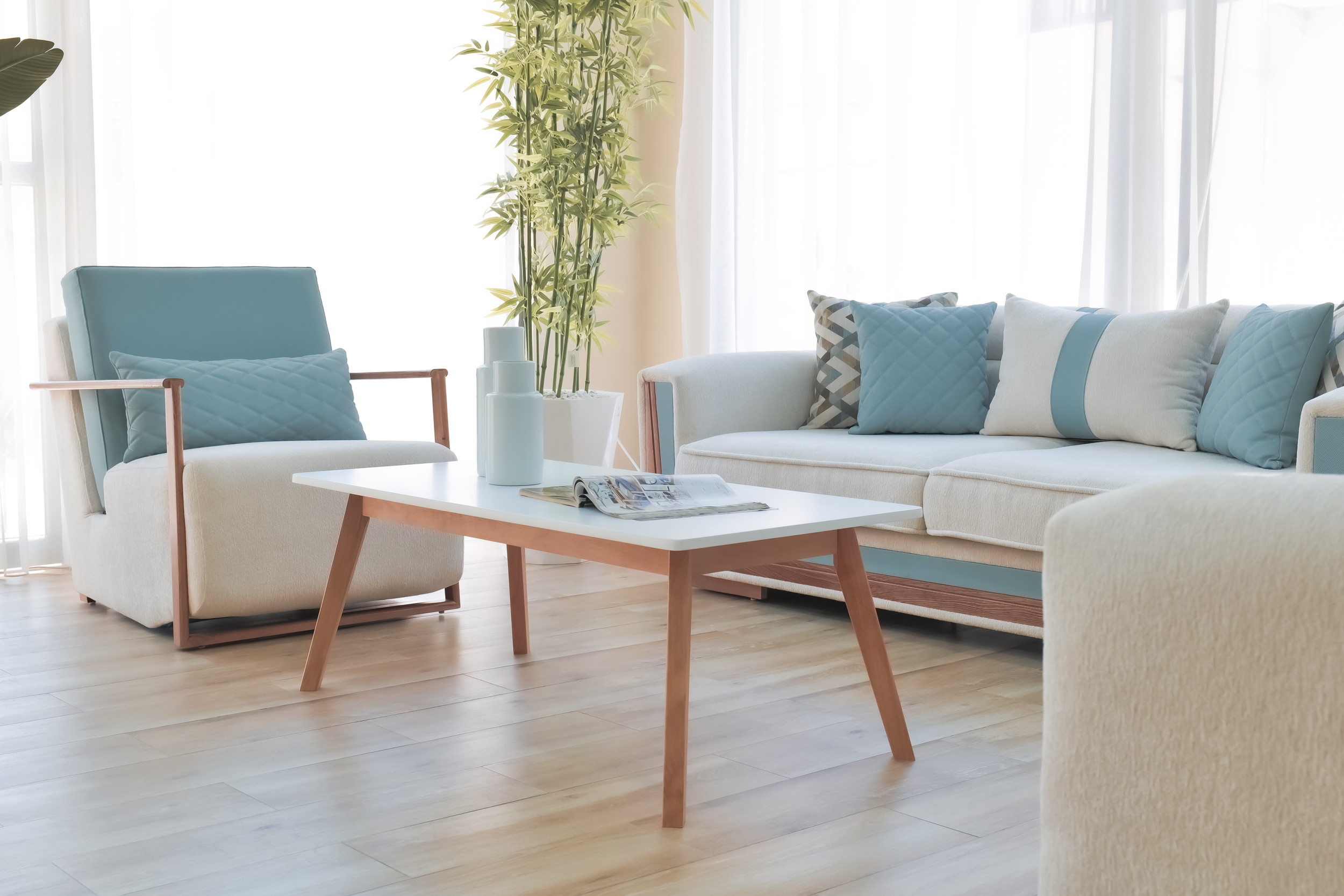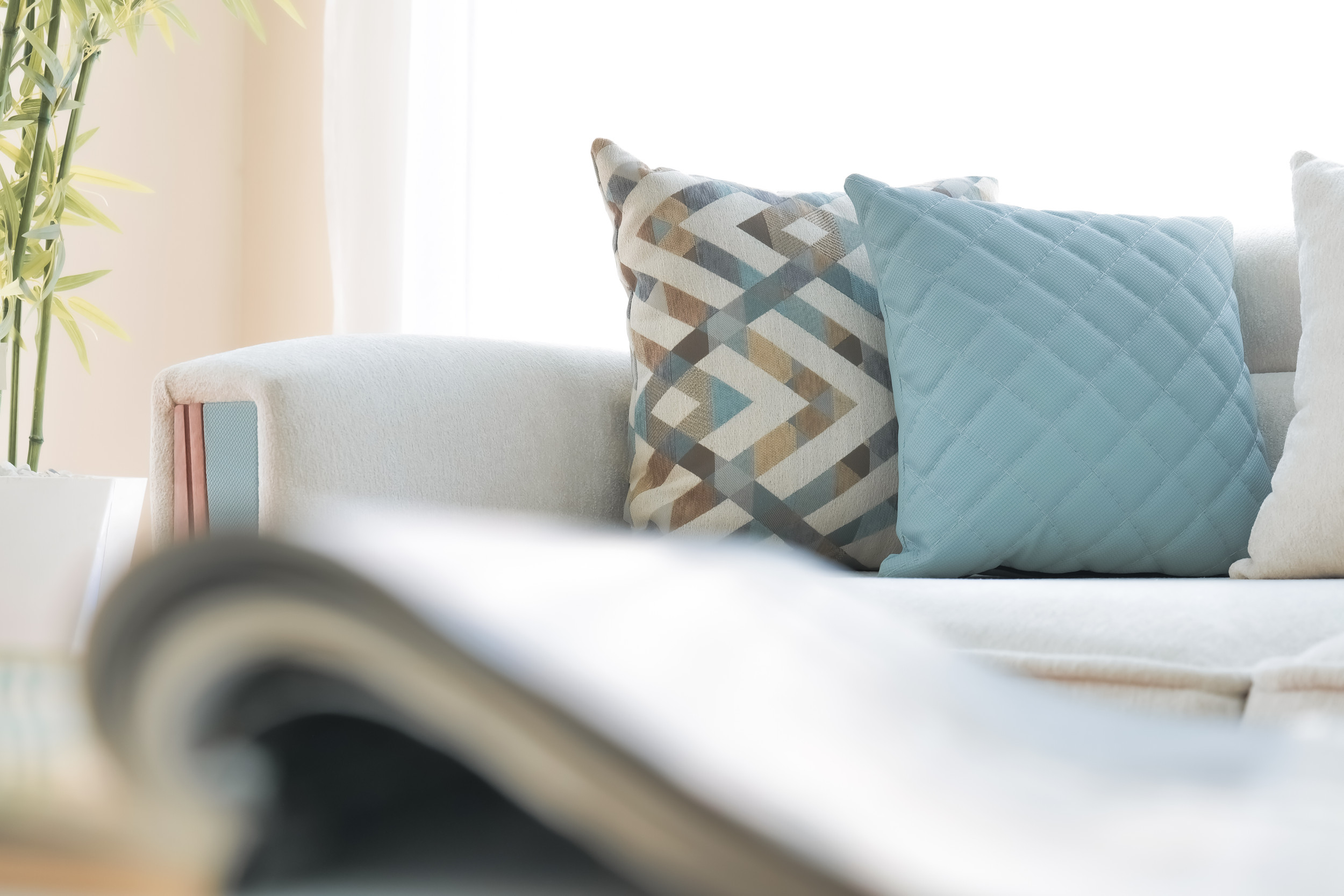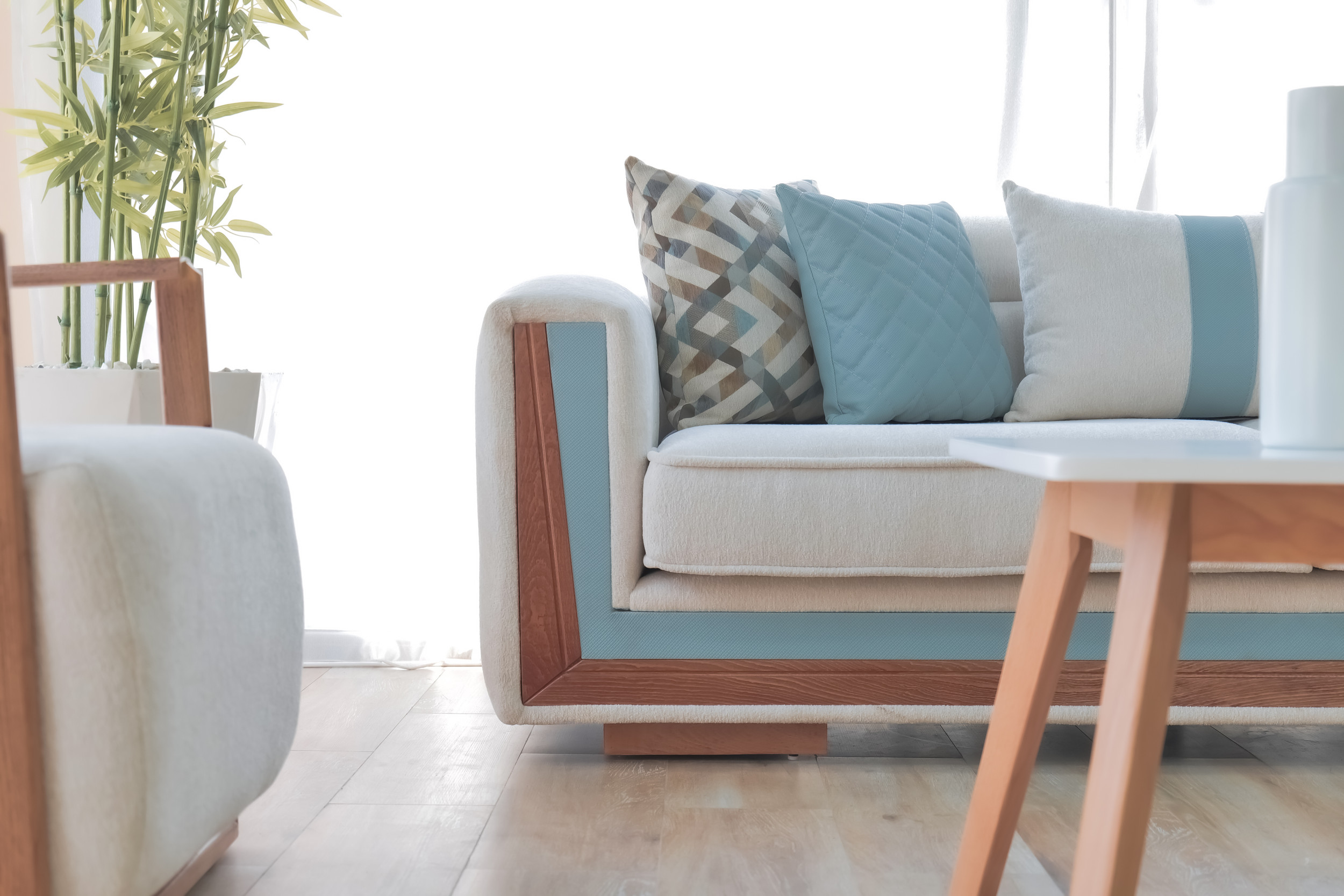 Le mélange harmonieux de tissu clair et de touches de bleu froid introduit une énergie rafraîchissante d’inspiration côtière : calme, aérée et délicieusement moderne. La profondeur d’assise généreuse et les coussins de dossier offrent un confort décontracté, tandis que les coussins géométriques offrent un contrepoint visuel vivant qui rehausse le design général.