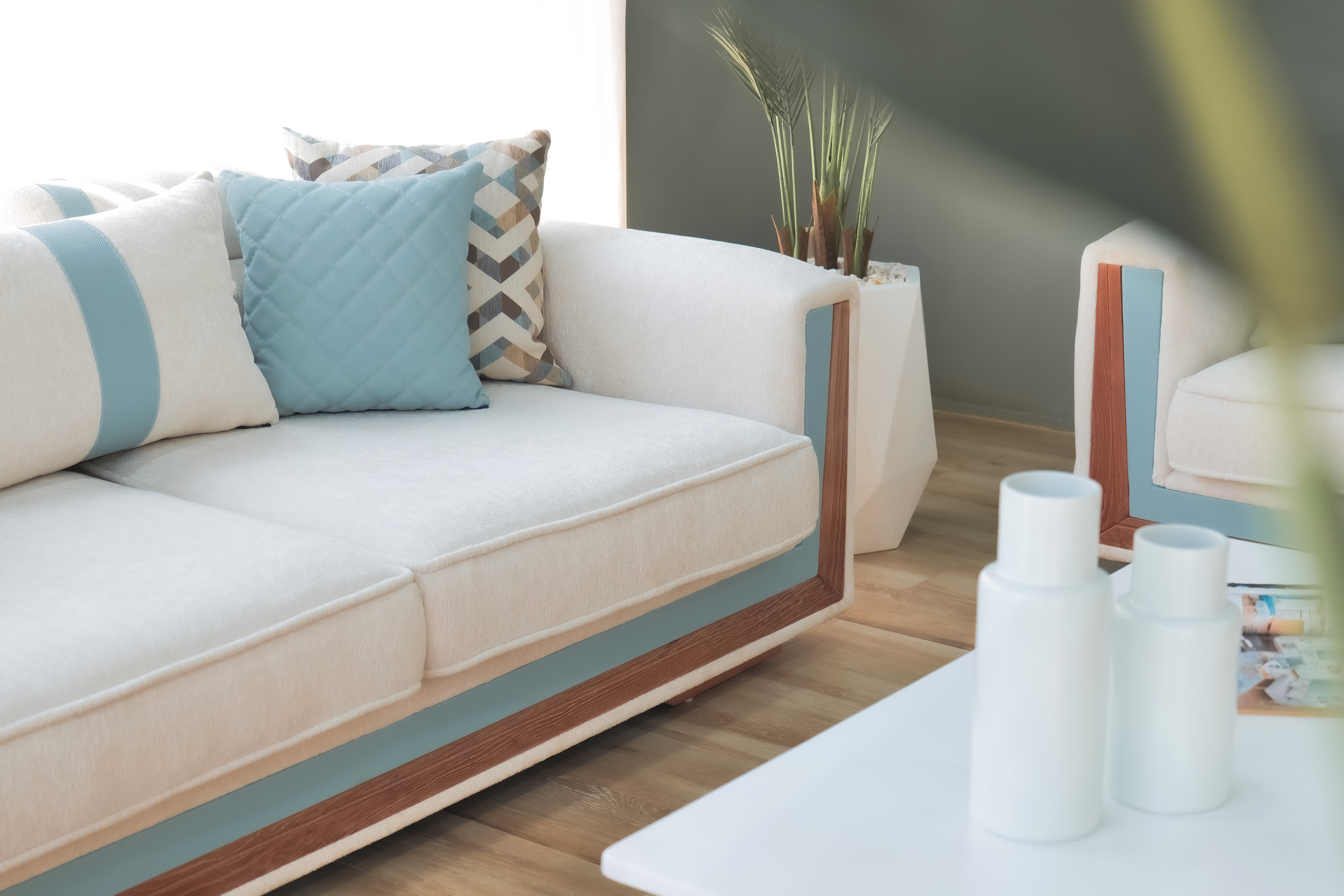 - Un ensemble de vases en céramique sculpturaux dans des blancs doux ou des bleus atténués pour faire écho aux tons apaisants du canapé