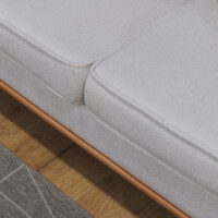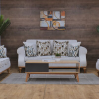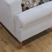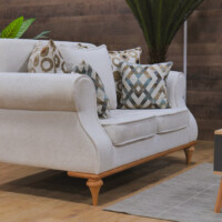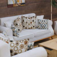 Le revêtement est constitué d’un tissu lisse et subtilement texturé qui rehausse le caractère doux de l’ensemble. L’assise profonde et les coussins de dossier moelleux offrent un confort exceptionnel, invitant à de longues conversations et à des moments de détente. Les coussins décoratifs introduisent un mélange ludique de motifs circulaires et géométriques, ajoutant une énergie visuelle qui complète la palette sereine du canapé.