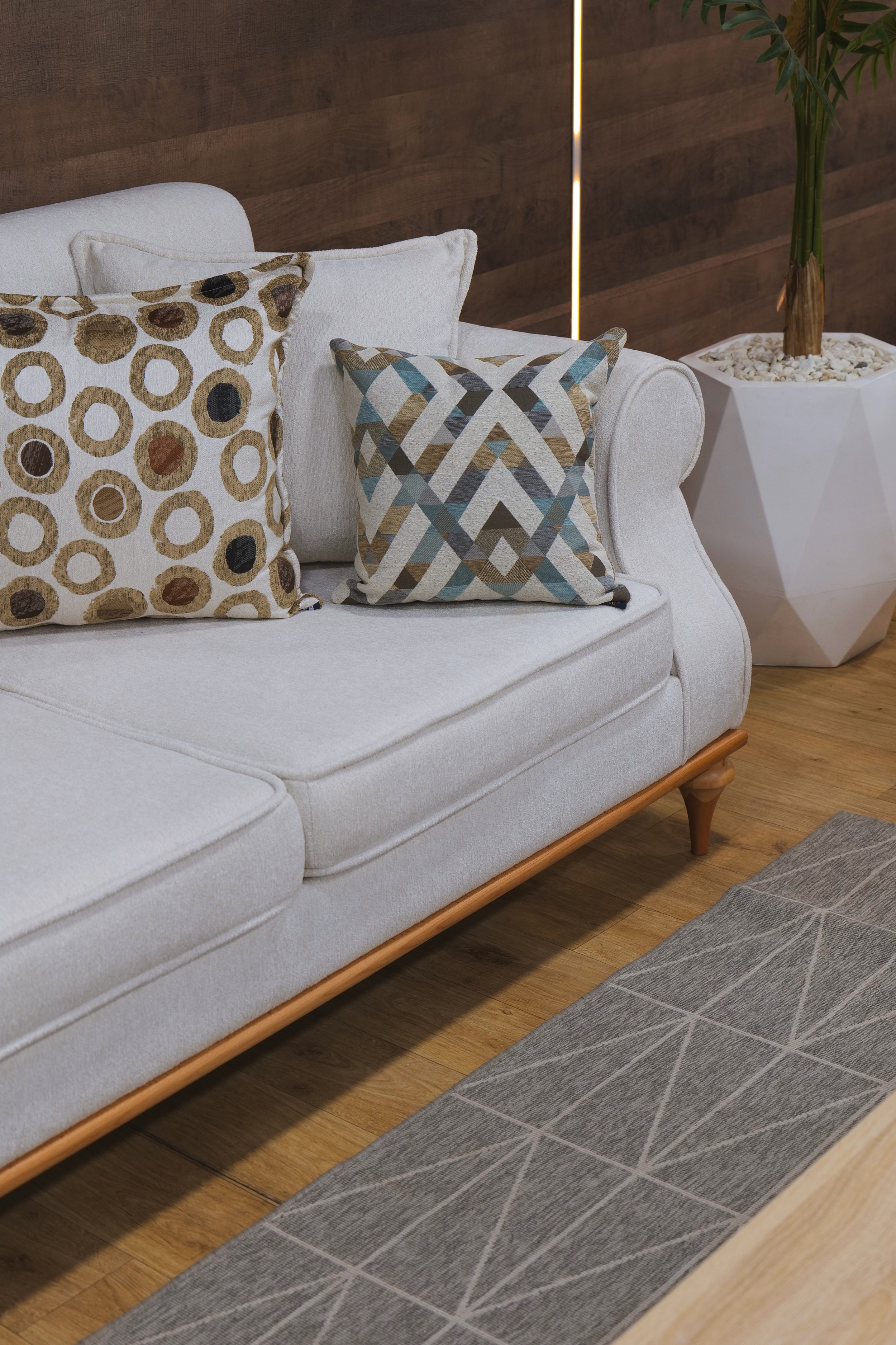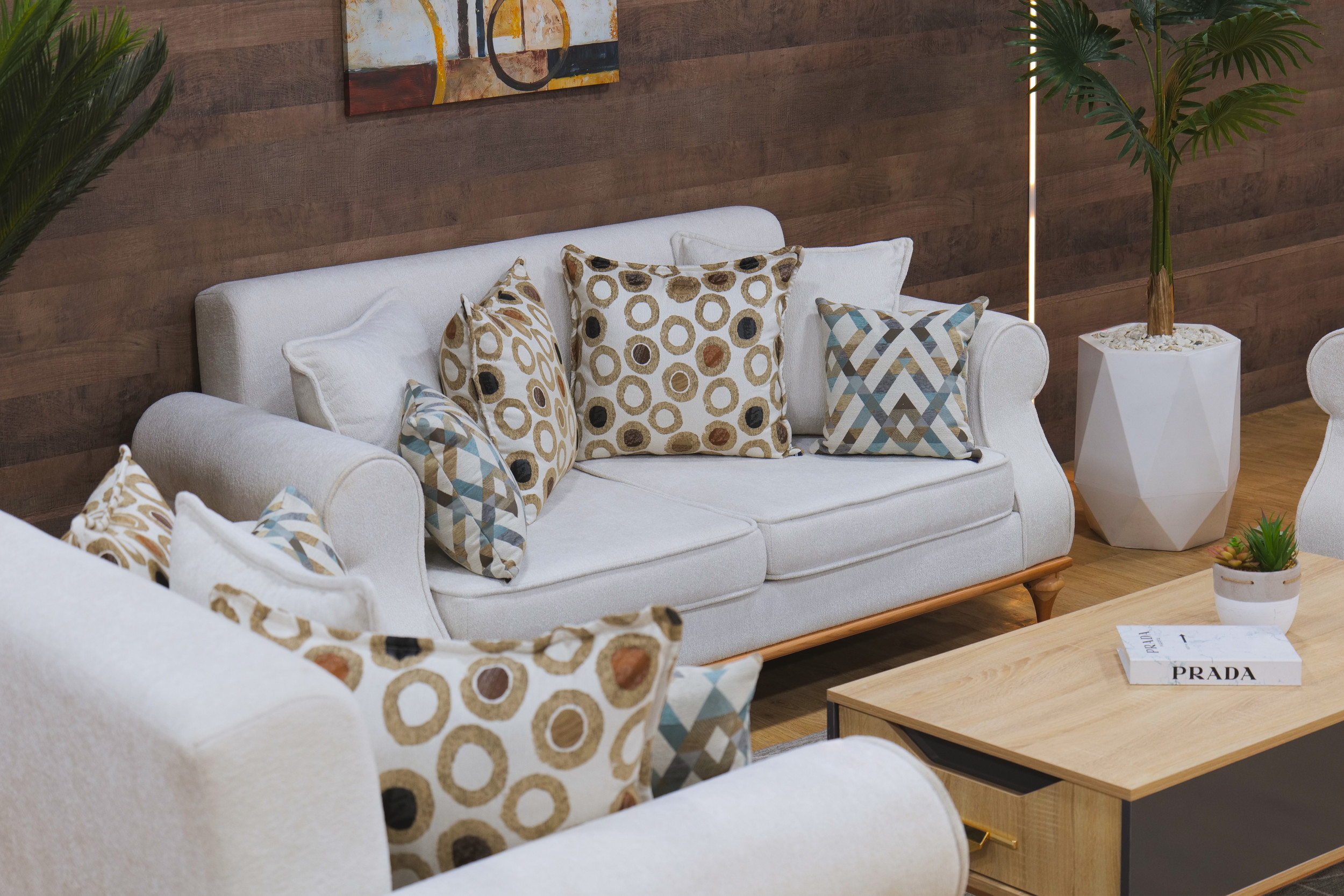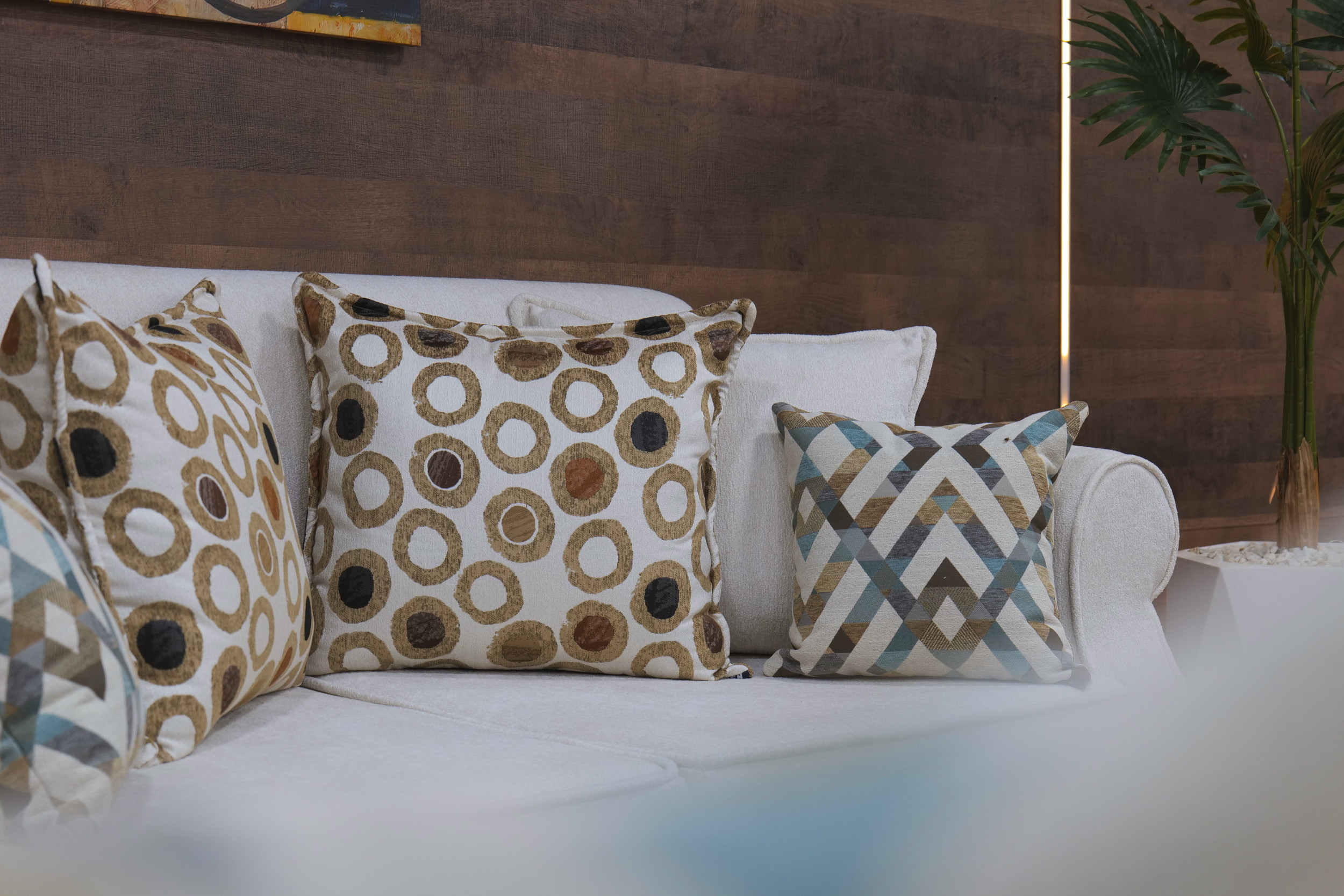 Le revêtement est constitué d’un tissu lisse et subtilement texturé qui rehausse le caractère doux de l’ensemble. L’assise profonde et les coussins de dossier moelleux offrent un confort exceptionnel, invitant à de longues conversations et à des moments de détente. Les coussins décoratifs introduisent un mélange ludique de motifs circulaires et géométriques, ajoutant une énergie visuelle qui complète la palette sereine du canapé.