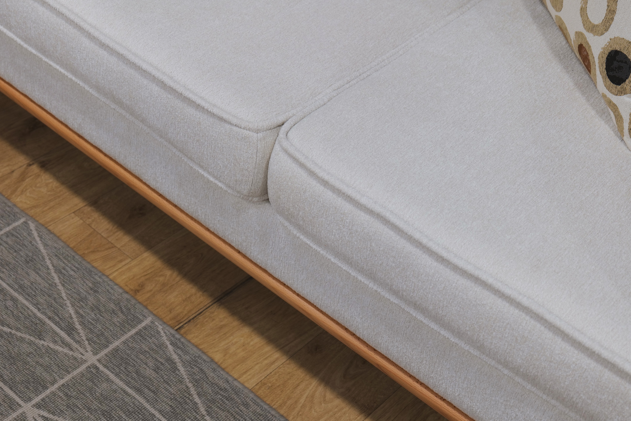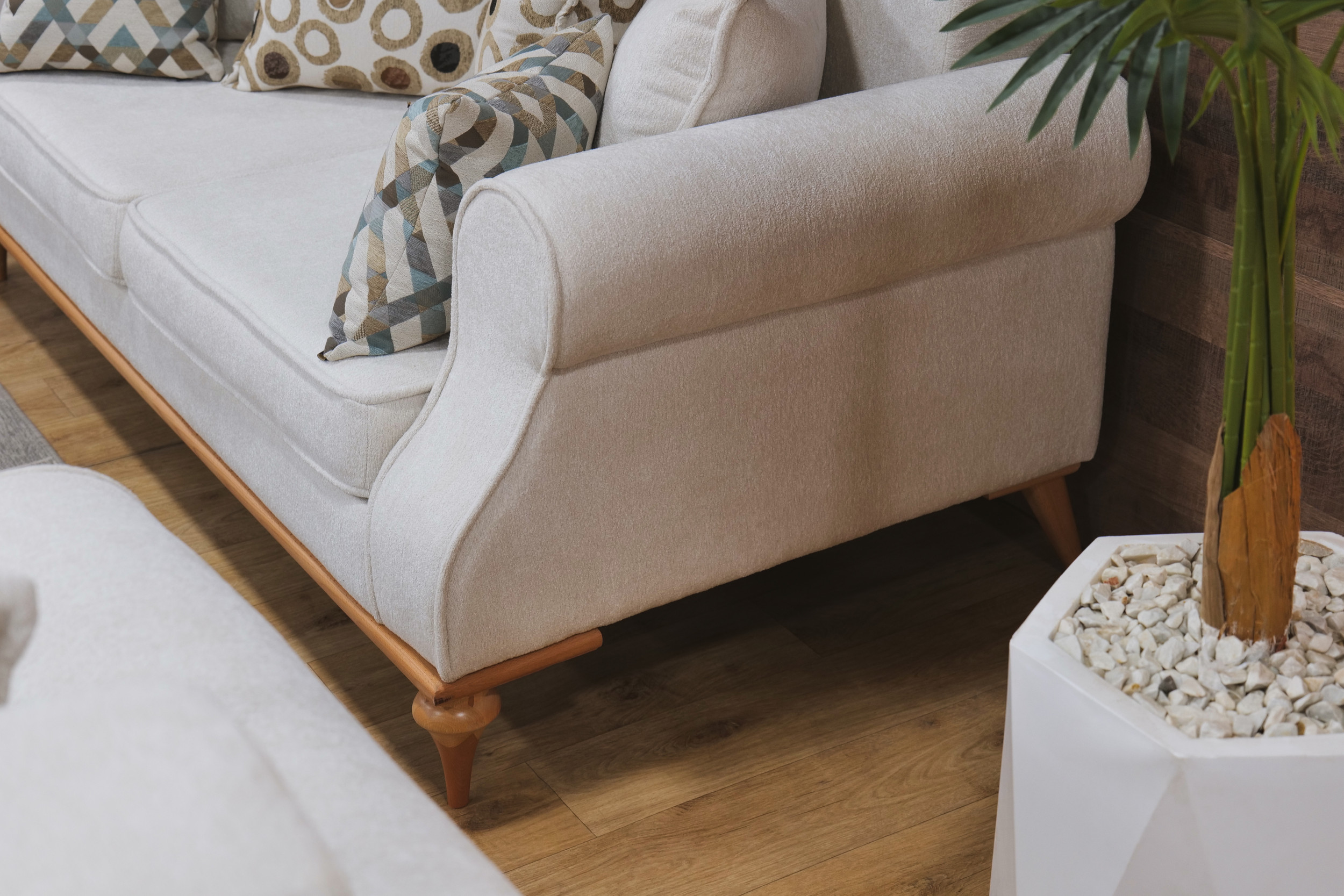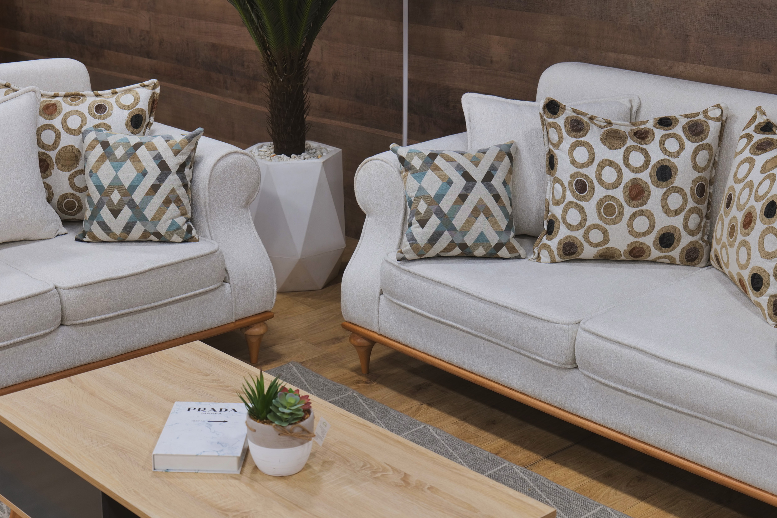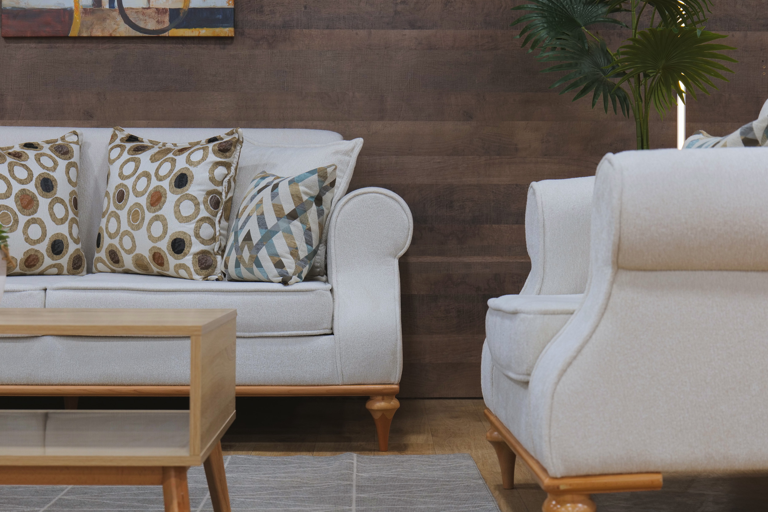 Le revêtement est constitué d’un tissu lisse et subtilement texturé qui rehausse le caractère doux de l’ensemble. L’assise profonde et les coussins de dossier moelleux offrent un confort exceptionnel, invitant à de longues conversations et à des moments de détente. Les coussins décoratifs introduisent un mélange ludique de motifs circulaires et géométriques, ajoutant une énergie visuelle qui complète la palette sereine du canapé.
