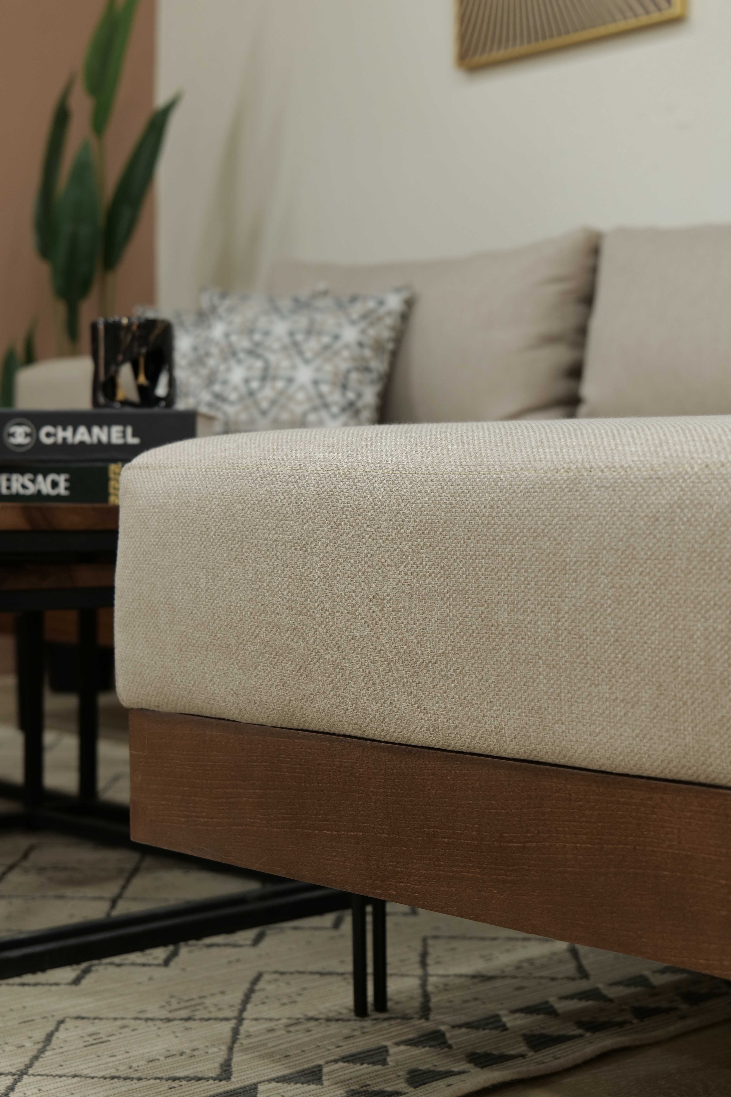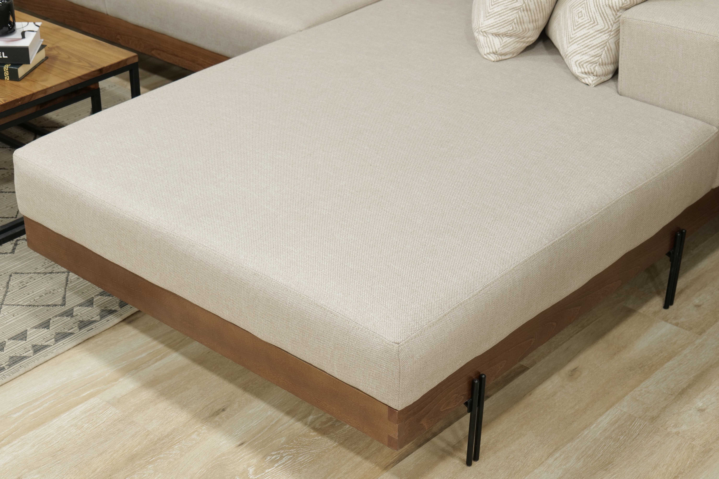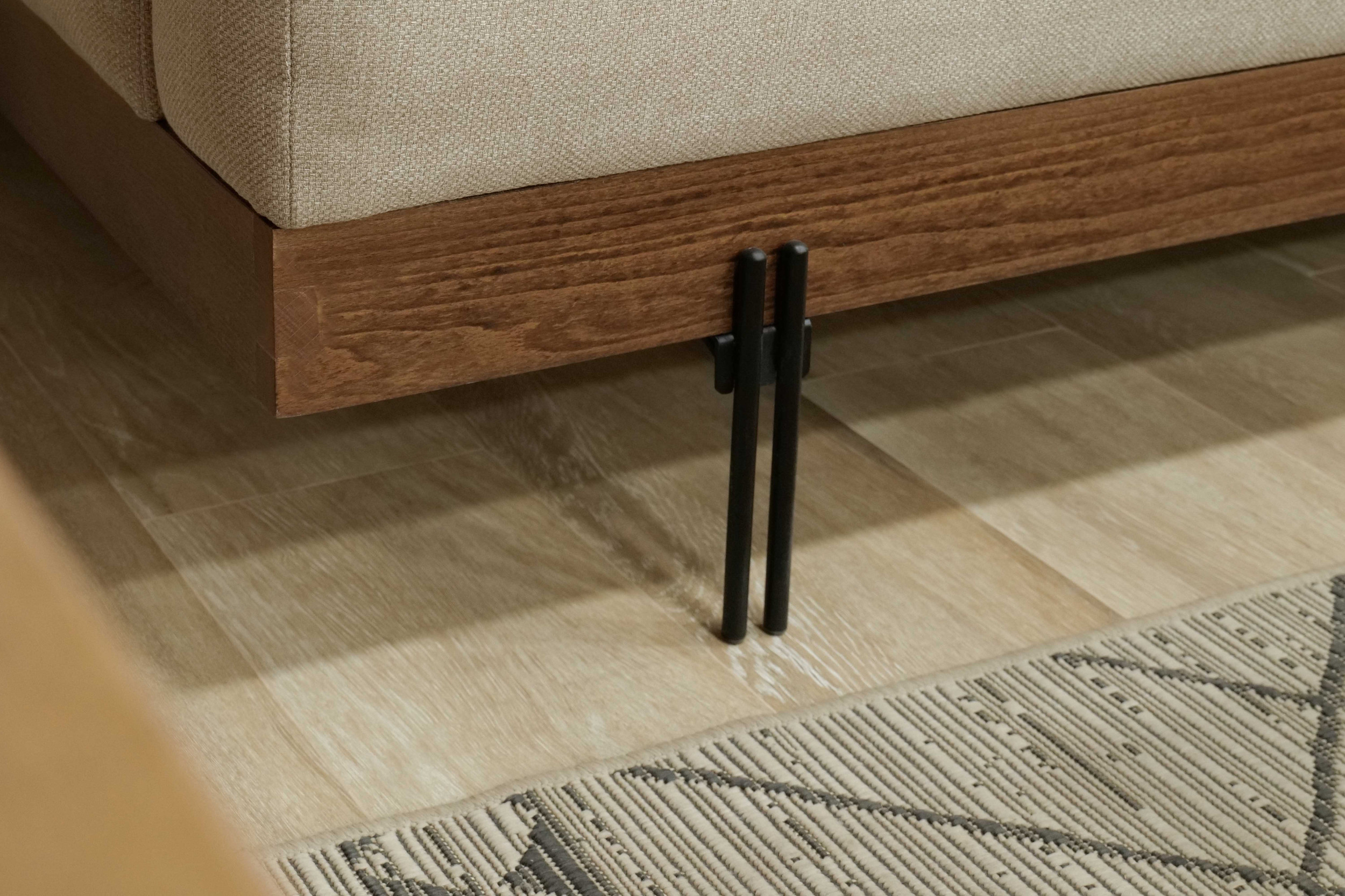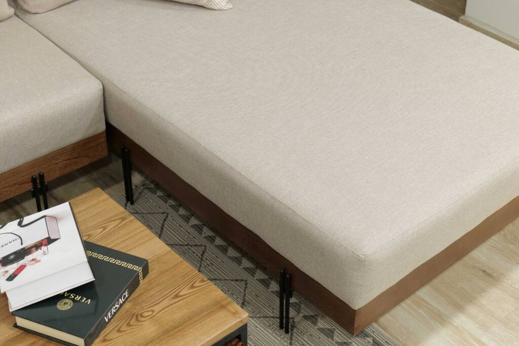 Le canapé est soutenu par de fins pieds en métal et une base en bois subtilement exposée, créant un effet flottant qui améliore l’ouverture et la fluidité visuelle. Cette structure surélevée allège la composition générale et renforce l’attrait architectural moderne de SLIM.